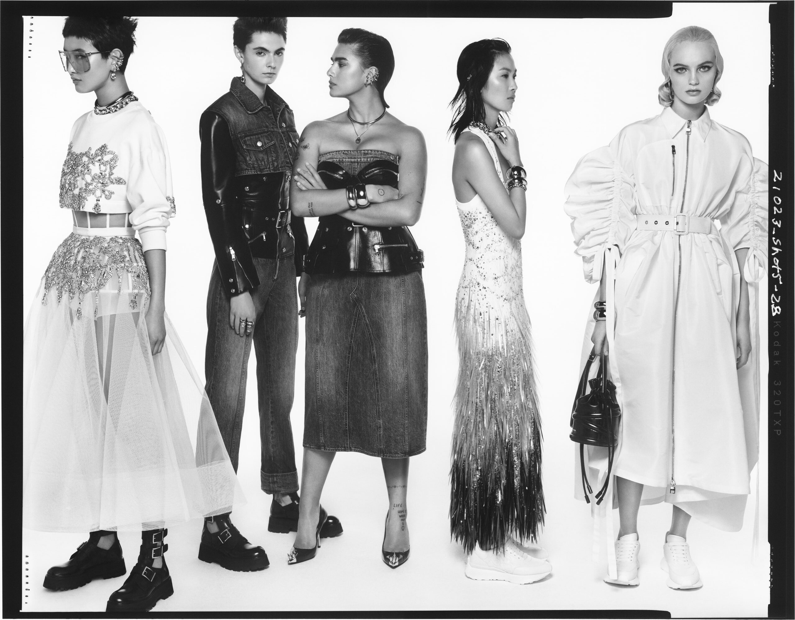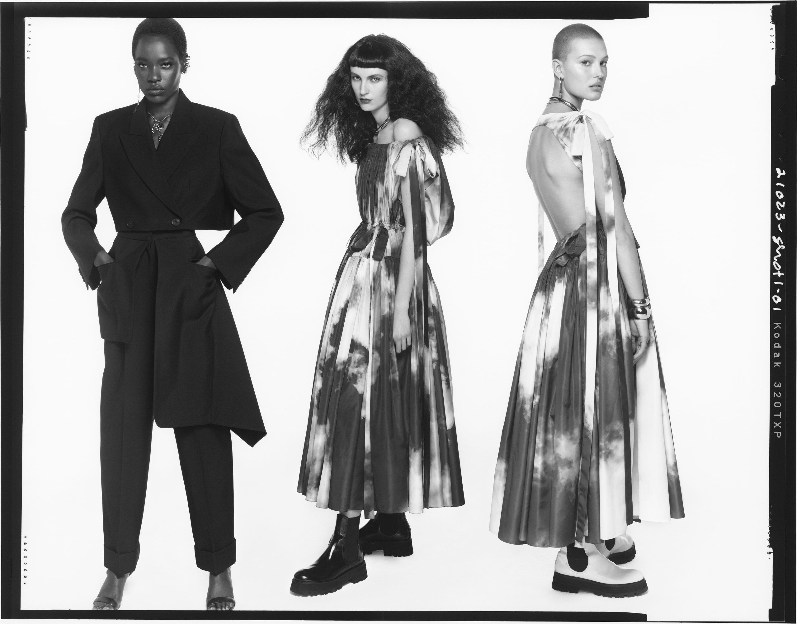 The Alexander McQueen Spring/Summer 2022 womenswear campaign starring Awar Odhiang, Lucia Fairfull, Celina Ralph, Sora Choi, Anok Yai, Arta Gee, Lara Stone, Eny Jaki, Wali Deutsch, Jill Kortleve, Cassie Wong, Fran Summers, Achenrin Madit, Florence Nicholls, Guinevere Van Seenus, Modupe Oluwalade and Jennifer Ball.