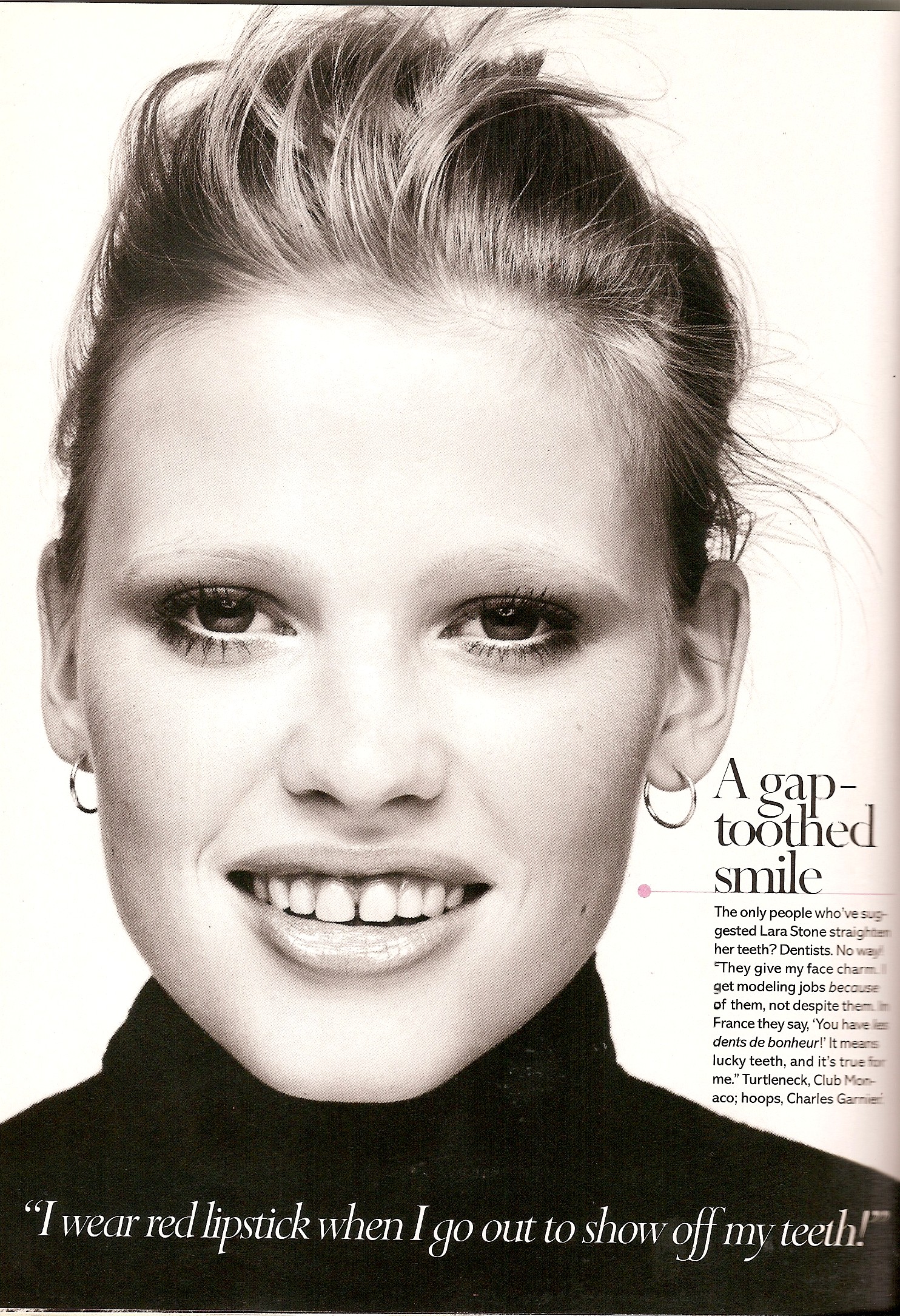 Self effacing, Lara coyly says she never look sexy, even though she constantly looks like she just crawled out of a compromising situation and claims her teeth are nothing special, a dental mistake and a tad yellow. "When I was little the family dentist insisted that when I grew my wisdom teeth my teeth would grow back together. Now every time I go to the dentist they always say, 'you really need to fix that gap of yours' I'm like, 'my gap is paying your dentist bills...'"![]()