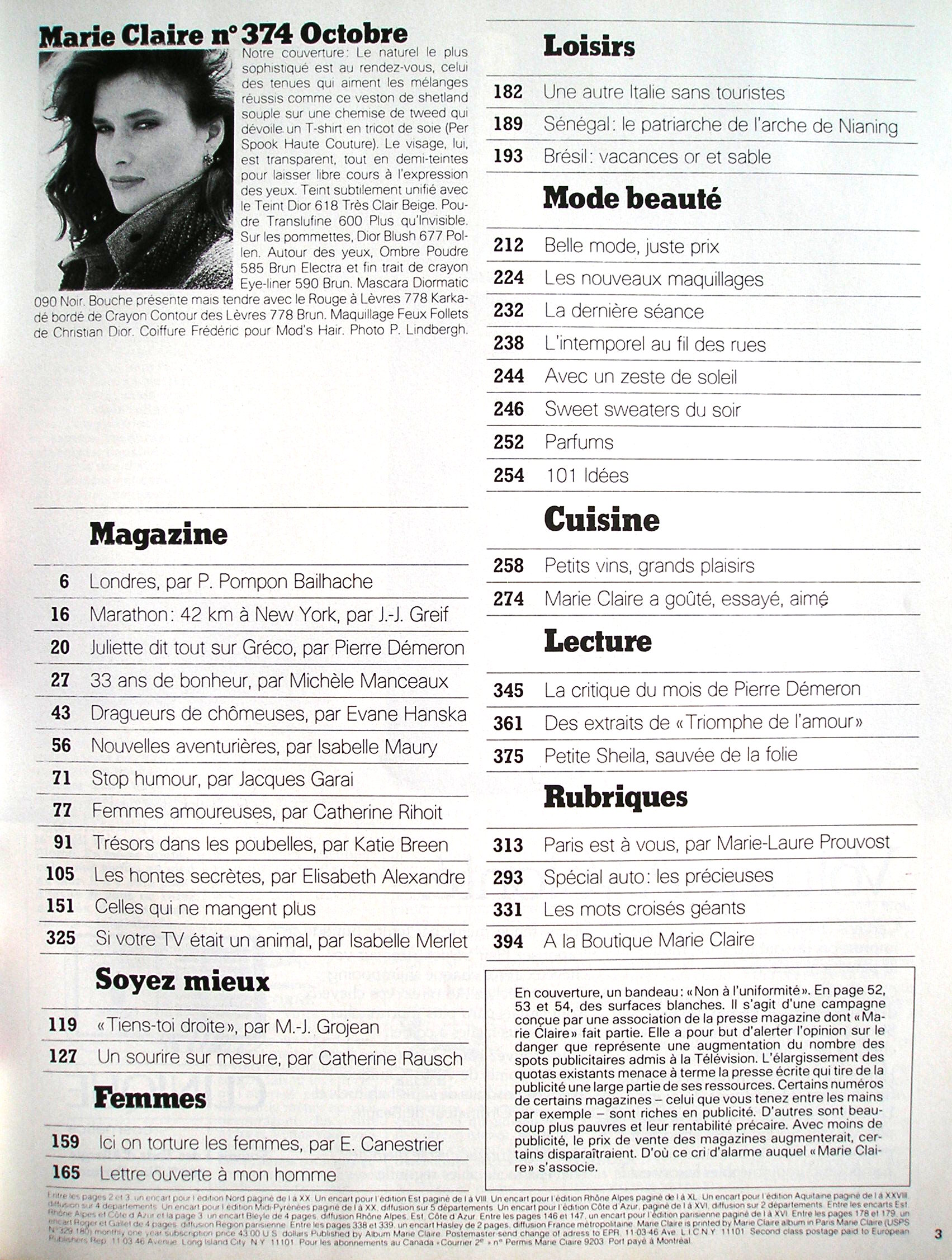 cover + cover-look french marie claire October 1983 #374 by Peter Lindbergh