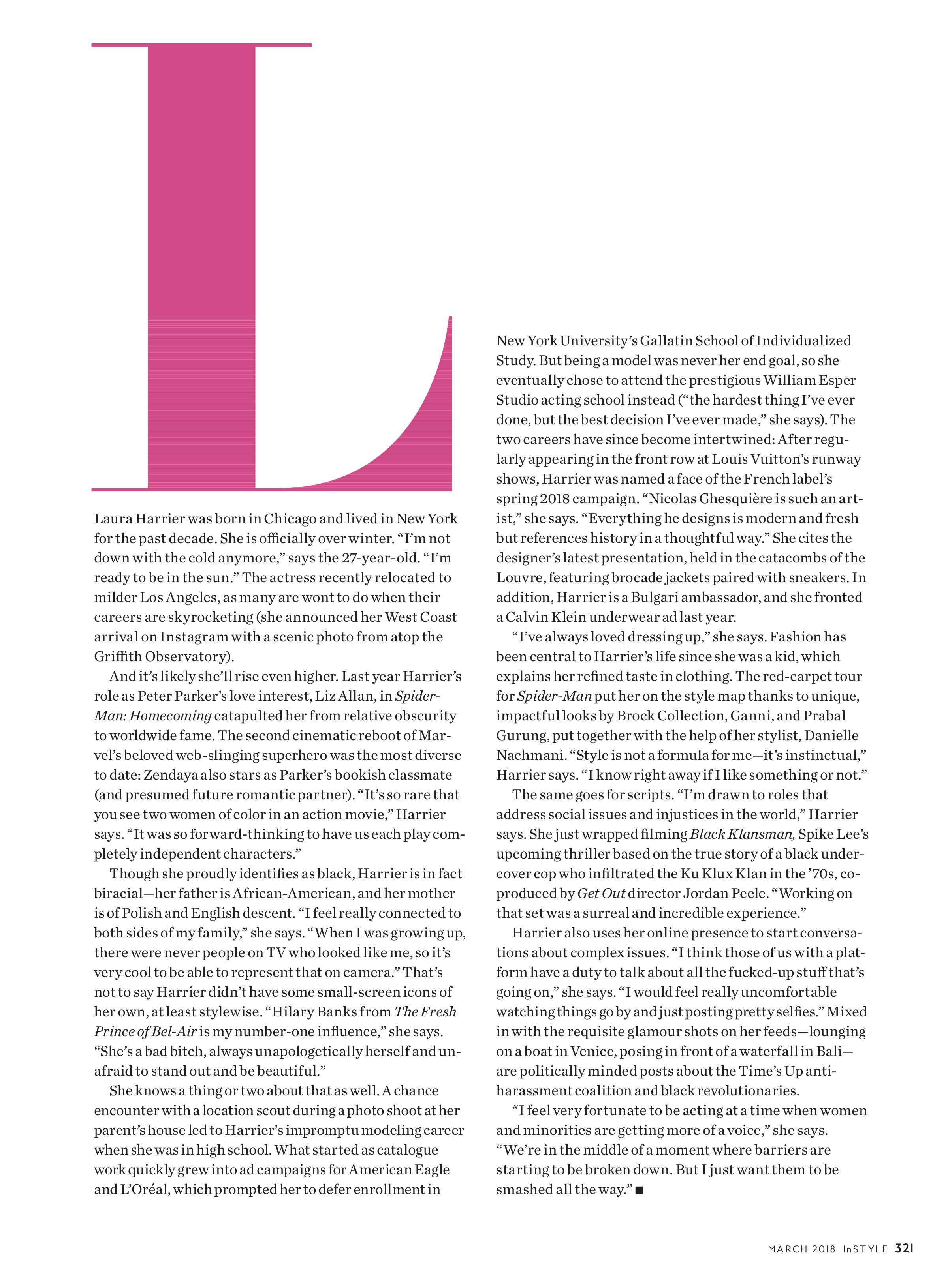 Laura Ruth Harrier (born March 28, 1990) is an American actress and model. Harrier was first recognized for her portrayal of Destiny Evans in the short-lived reboot of the American soap opera One Life to Live in 2013. In 2017, she made her major film debut portraying Liz in Spider-Man: Homecoming. Laura Harrier was born March 28, 1990 in Chicago, Illinois, and raised in Evanston, Illinois. She attended Evanston Township High School from 2004-2008. Her father works in insurance and her mother is a speech pathologist. She has one younger brother. Harrier left home for New York at age 18 to attend the New York University Gallatin School of Individualized Study. Upon arrival, Harrier fell into modeling and deferred enrollment to the University. Modeling was not a job that Harrier intended to do for long. Eventually, she decided that she wanted to pursue acting and attended William Esper Studio acting school in New York City. She has lived in New York City ever since. Harrier appeared in the reboot of American soap opera One Life to Live (2013) as Destiny Evans. She has also been in projects such as The Last Five Years (2014), and 4th Man Out (2016). Harrier had her major film debut playing former love interest Liz in Spider-Man: Homecoming (2017). In June 2017, it was announced that Harrier would be portraying Millie Montag in HBO's film adaptation of acclaimed novel Fahrenheit 451, opposite Michael B. Jordan.