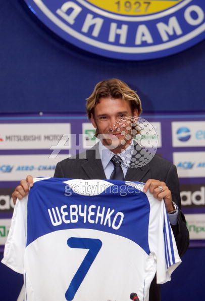 Head coach of FC Dynamo Kiev Valery Gazaev (L), new player of the club Ukrainian Andriy Shevchenko © and President of FC Dynamo Kiev Igor Surkis hold up Shevchenko's new jersey during his presentation in Kiev on August 30, 2009. The former Chelsea player and European Footballer of the Year Shevchenko signed a two-year contract in Kiev on August 29.