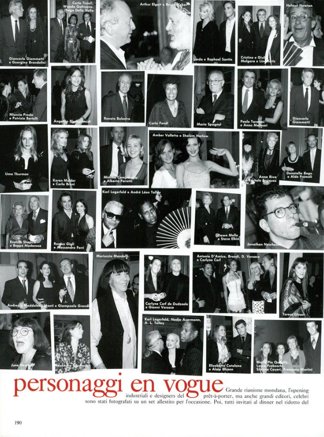 Models: François Nars, Raphael Santin, Naomi Campbell, Azzedine Alaïa, Benjamin Forrest, Linda Evangelista, Doug Lloyd, Isabella Rossellini, Steven Meisel, Joan Juliet Buck, Jim Moffatt, Bruce Weber, Karl Lagerfeld, Stefano Gabbana, Monica Bellucci, Domenico Dolce, Isabella Ferrari, Michel Comte, Albert Watson, Roxanne Lowit, Elizabeth Saltzman, Arthur Elgort, Mariane Houtenbos, Dayle Haddon, Walter Chin, Satoshi Saikusa, Mika Mizutani, Gianfranco Ferré, Marina Schiano, Grace Coddington, Alice Gentilucci, Gianpaolo Barbieri, Manuela Pavesi, André Leon Talley & many more people