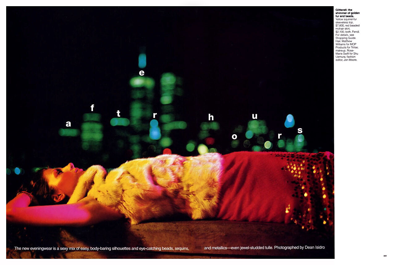 Magazine: Elle US (September 1999) Title: After Hours Photographer: Dean Isidro Model: Vanessa Greca bwgreyscale