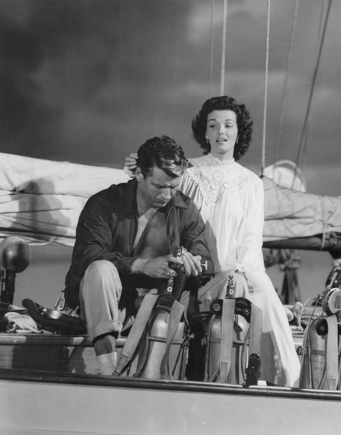 Ernestine Jane Geraldine Russell was born on June 21, 1921 in Bemidji, Minnesota. Her father was a United States Army lieutenant and her mother had been a student of drama and an actress with a traveling troupe. Once Mr. Russell was mustered out of the service, the family took up residence in Canada, but moved to California when he found employment there. The family was well-to-do and although Jane was the only girl among four brothers, her mother saw to it that she took piano lessons. In addition to music, Jane was interested in drama much as her mother had been and participated in high school stage productions. Upon graduation, Jane took a job as a receptionist for a doctor who specialized in foot disorders. Although she had originally planned on being a designer, her father died and she had to go to work to help the family. Jane modeled on the side and was very much sought-after especially because of her figure.