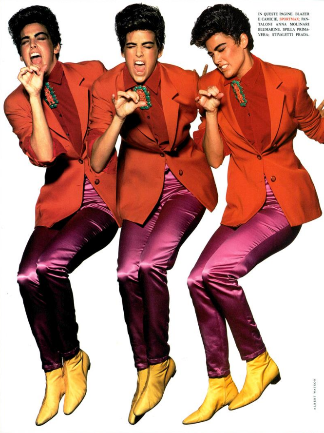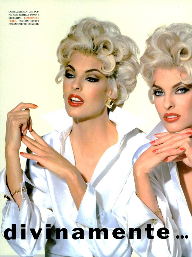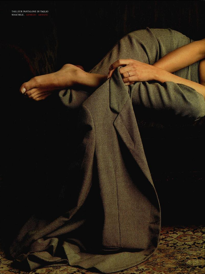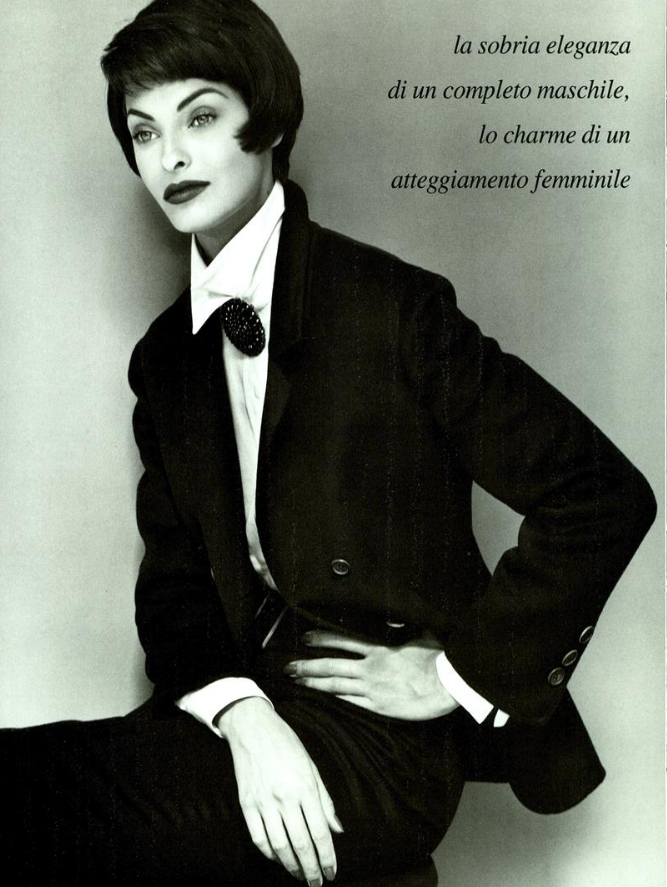 "Lady or Sir?" Model: Linda Evangelista Photographer: Steven Meisel Stylist: Paul Cavaco Hair: Garren Makeup: Kevyn Aucoin