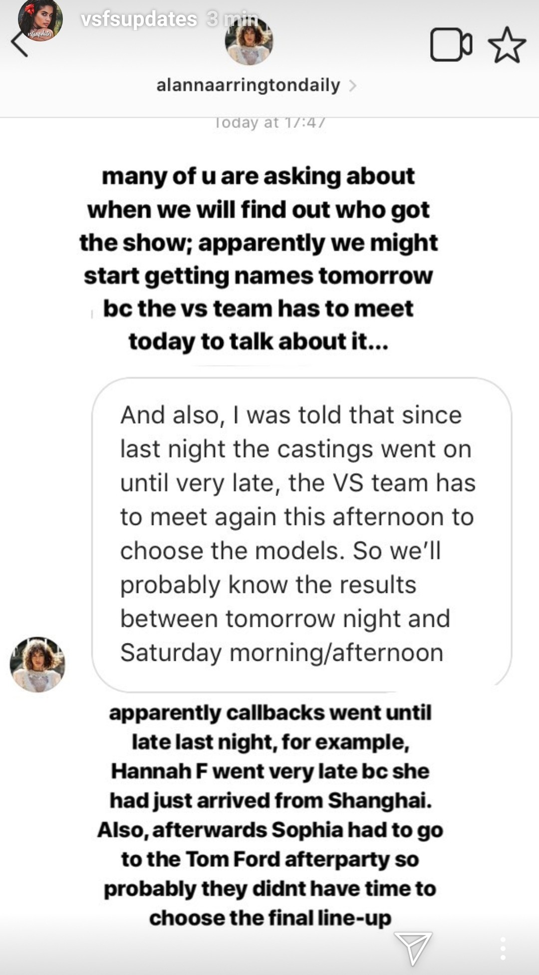 While it is very likely they will all walk the show, we have no confirmation they are walking. Also, this has been happening for years, some girls don't do castings because they are A- Power names (the Hadids) or B- They work regularly with VS through the year and have runway experience with VS and in the HF (Alexina, Ming and Cindy) so there's really no need to see them again.