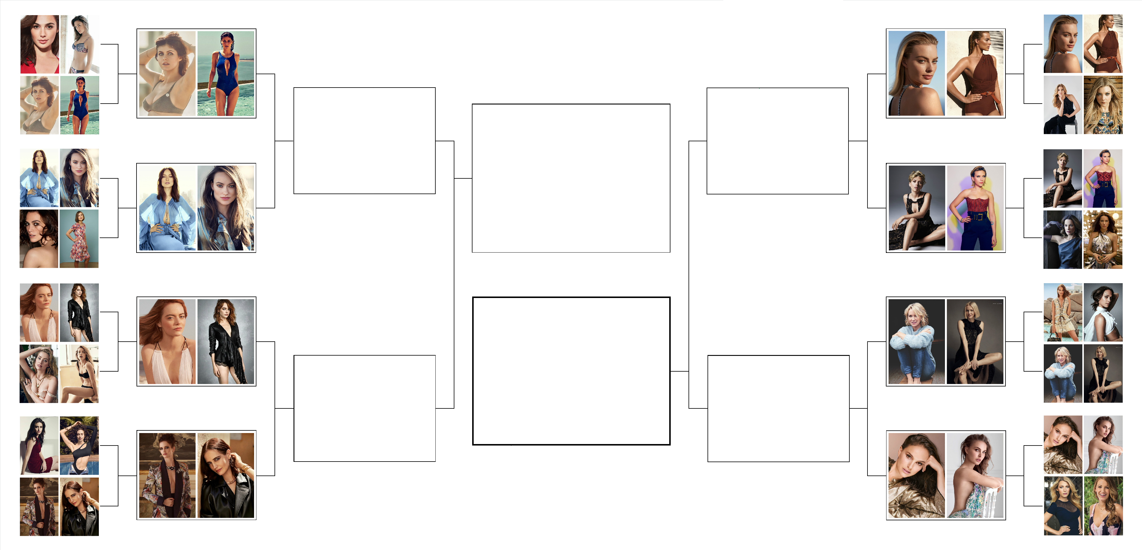 Margot Robbie continues her fine form in this tournament, as does Natalie Portman. Naomi Watts upsets the no. 3 seed Alicia Vikander, while Scarlett Johansson against Kate Beckinsale proved to be just as tough a match as it looked on paper. I'm voting for Scarlett though.