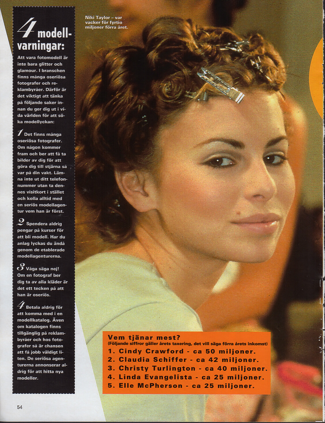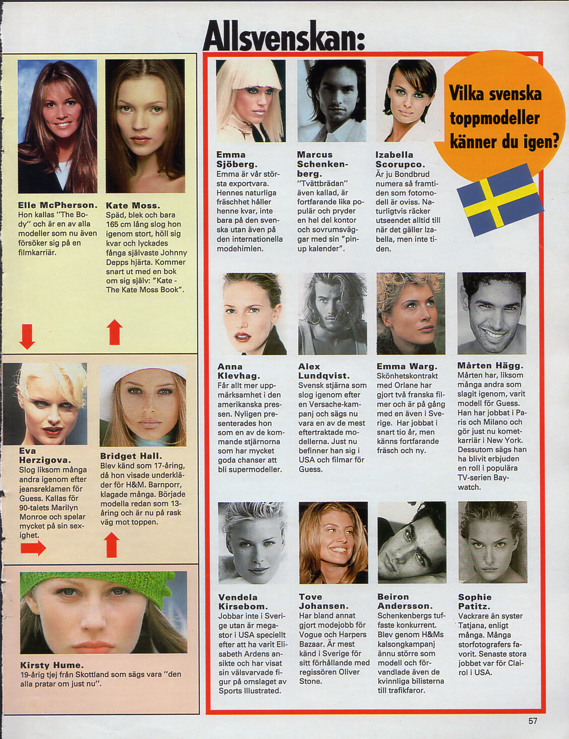 "Nya modell-extra Annorlunda bättre #n vacker" - VECKO Revyn Sweden 20. September 1995 #38 - also showing Emma Sjöberg, Kate Moss, Eva Herzigova, Naomi Campbell, Carla Bruni, Nadja Auermann, Claudia Schiffer, Linda Evangelista, Christy Turlington, Helena Christensen, Cindy Crawford, Elle MacPherson, Tyra Banks, Stephanie Seymour, Karen Mulder, Bridget Hall, Trish Goff, Liv Tyler, Amber Valletta, Navia Nguyen, Kirsty Hume, Marcus Schenkenberg Izabella Scorupco, Anna Klevhag, Alex Lundqvist, Emma Warg, Marten Hägg, Vendela Kirsebom, Tove Johansen, Beiron Anderon, Sophie Patitz
