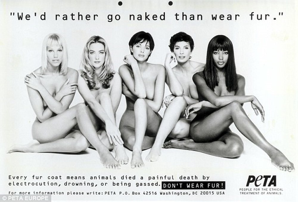 A photoshoot by Patrick Demarchelier for PETA. The BW image later appeared in a 1994 issue of French Photo. Also with Ella Sjoberg, Tatjana Patitz, Fabienne Terwingh, and Naomi Campbell.