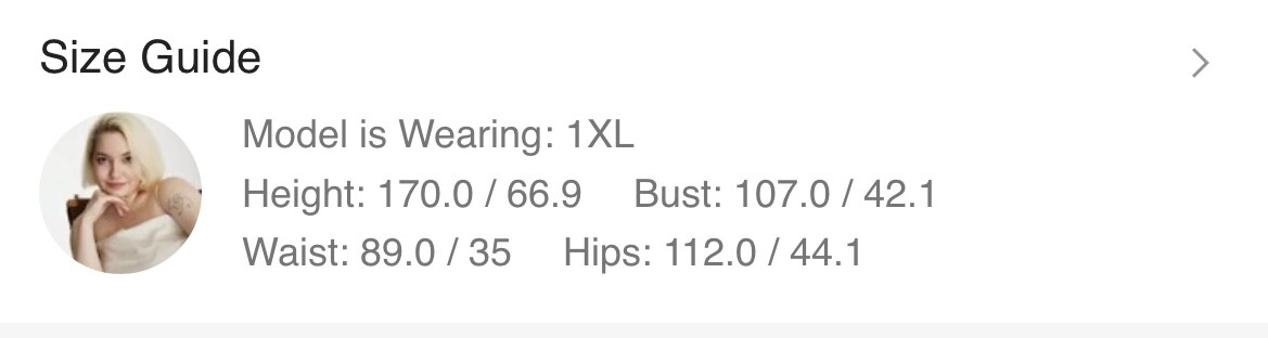 Height: 170.0 / 66.9 Bust: 107.0 / 42.1 Waist: 89.0 / 35 Hips: 112.0 / 44.1