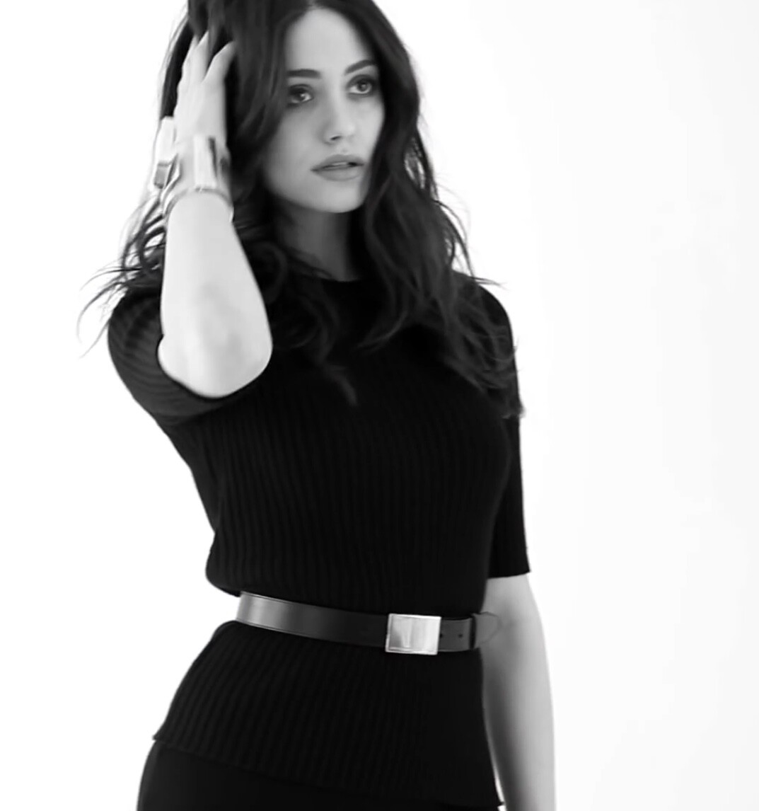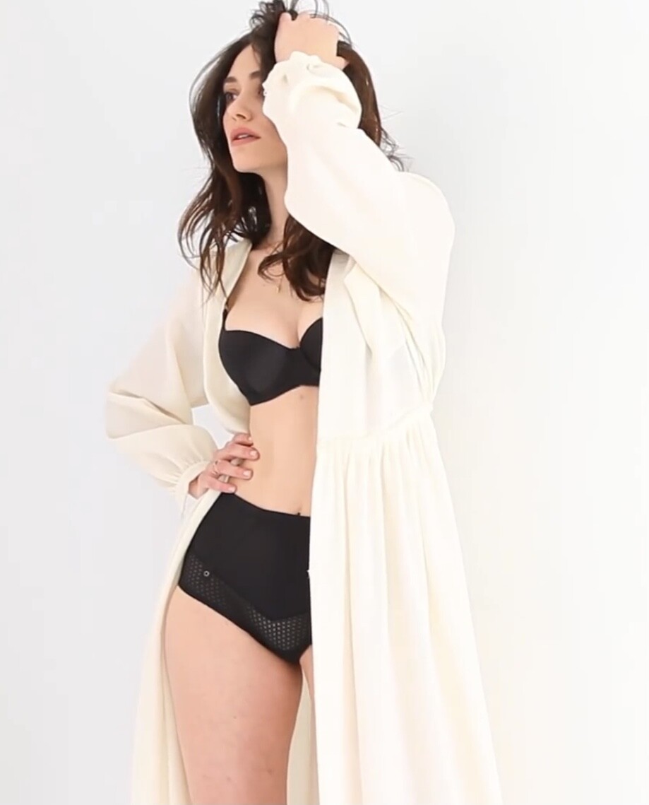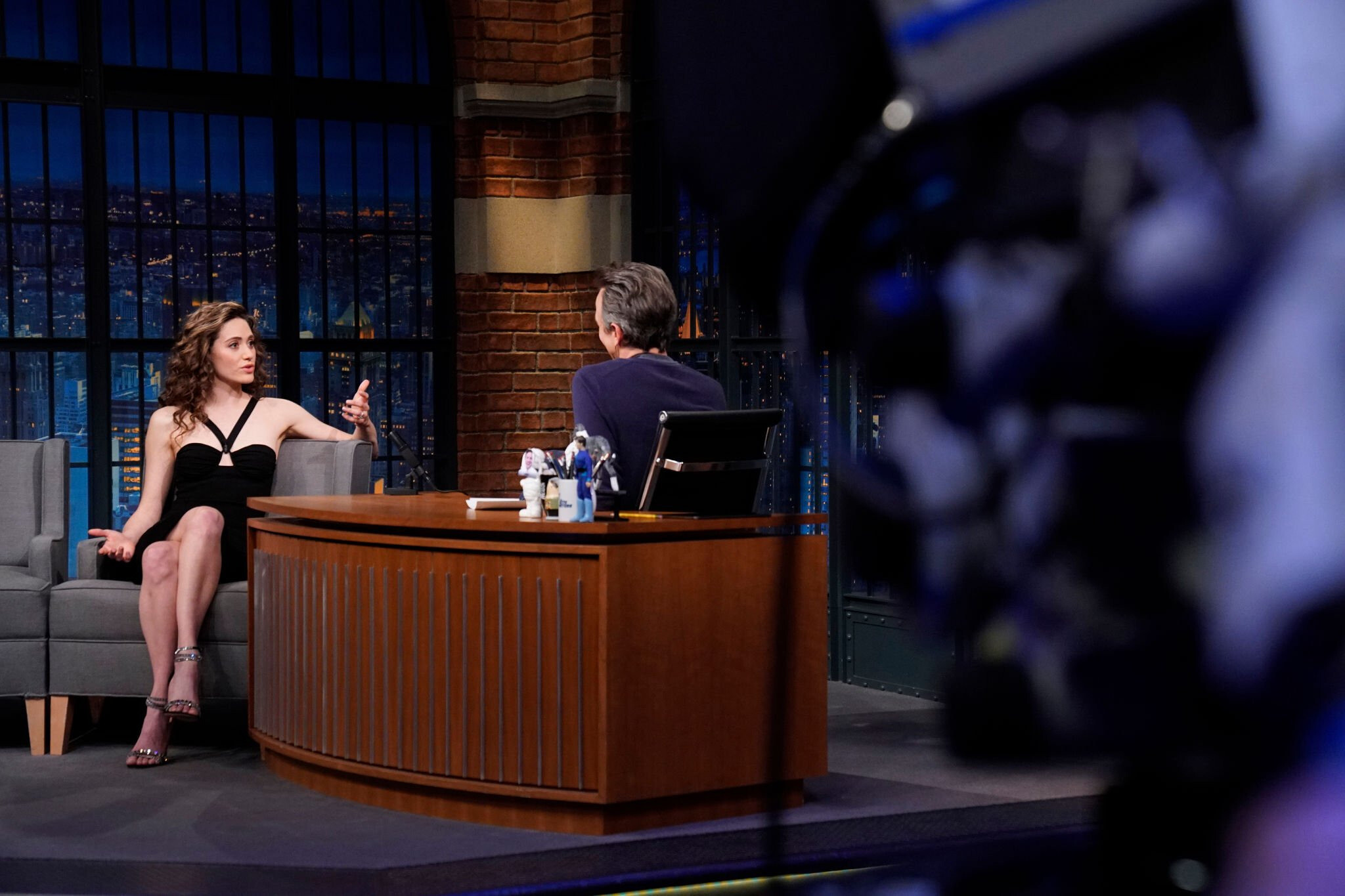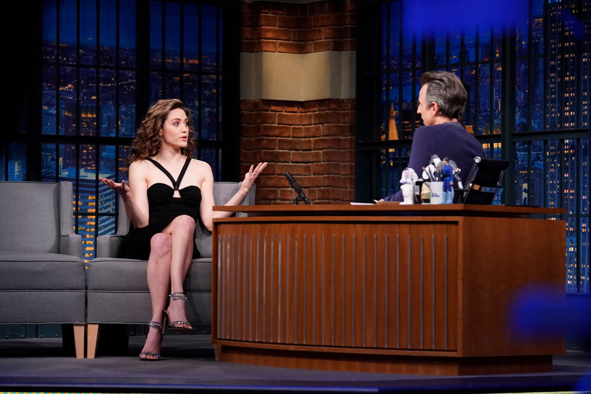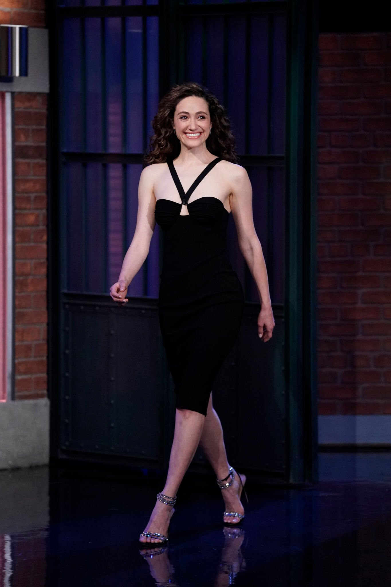 Emmy Rossum in a black strapless column dress with a sweetheart neckline 05/11/2022