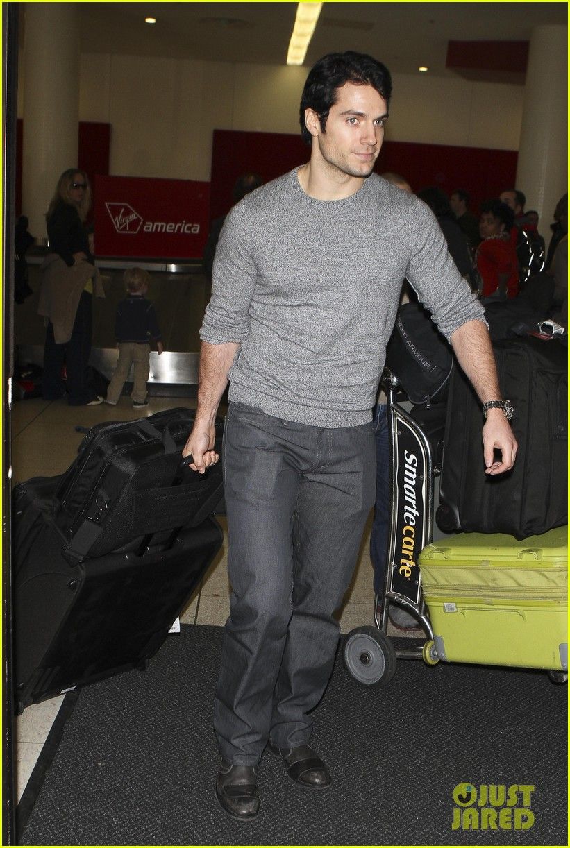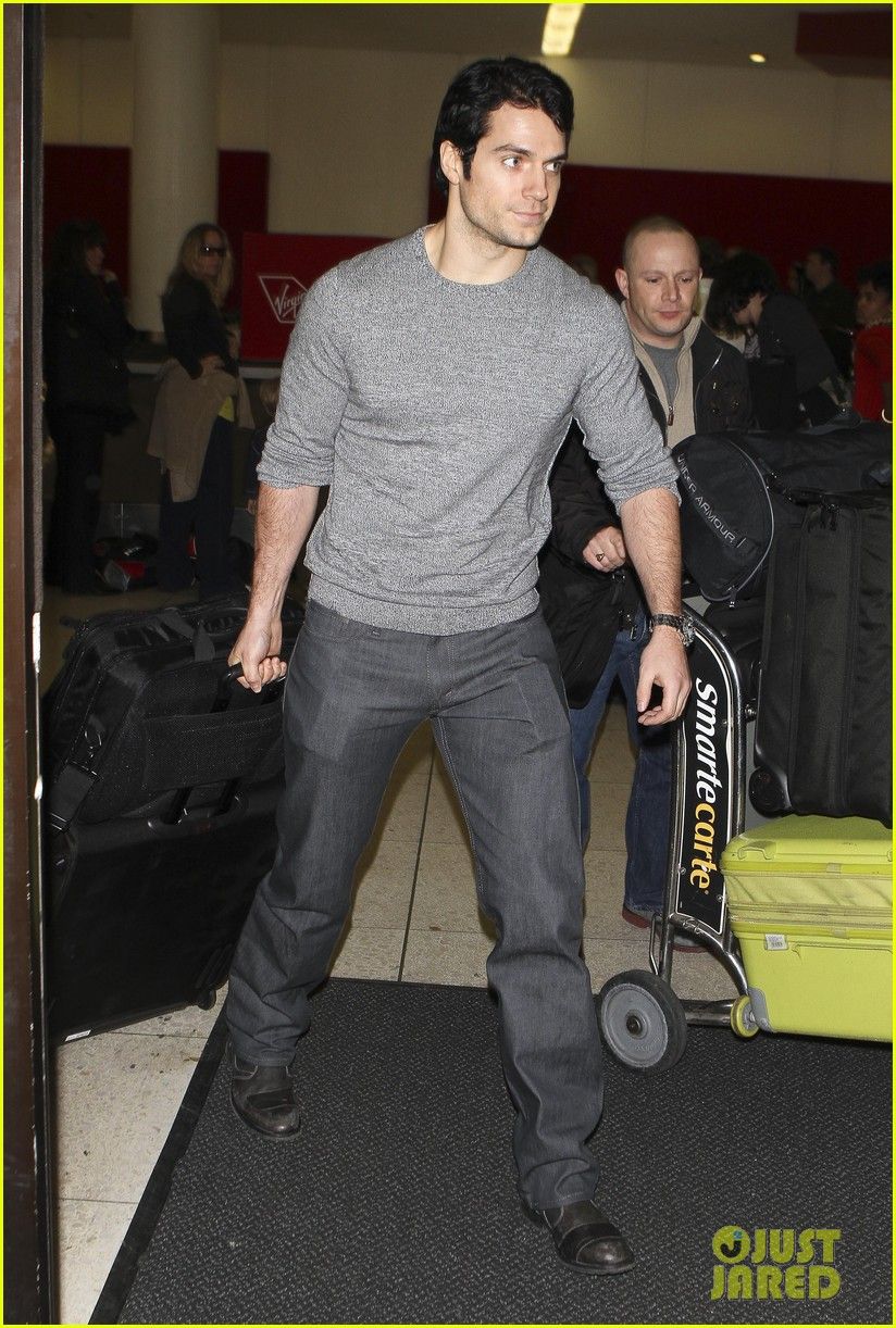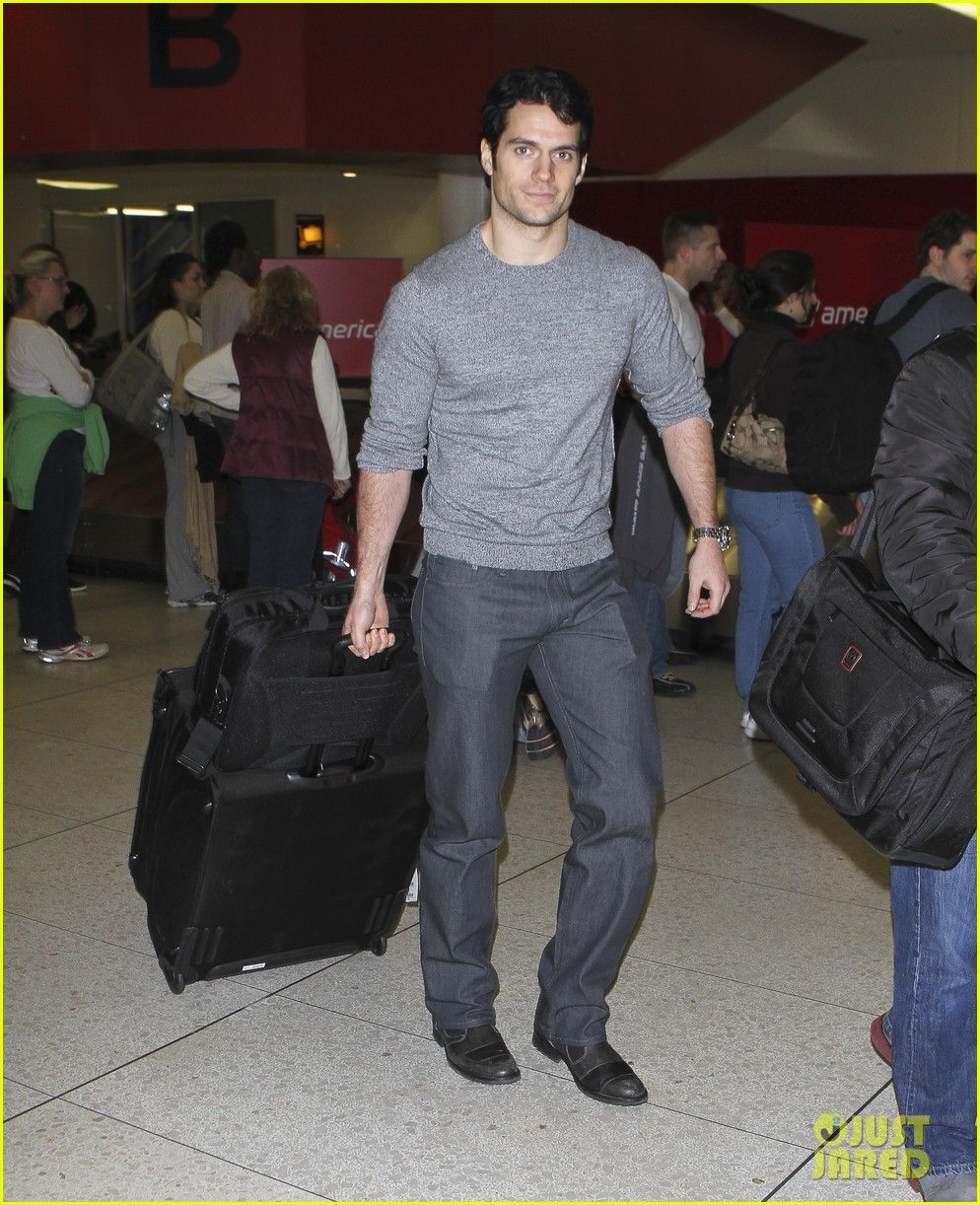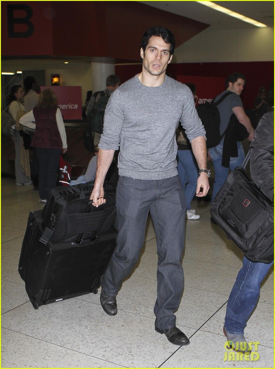 Henry Cavill carries a purple package while waiting for a flight at the airport on Saturday (October 15) in Vancouver, British Columbia, Canada.