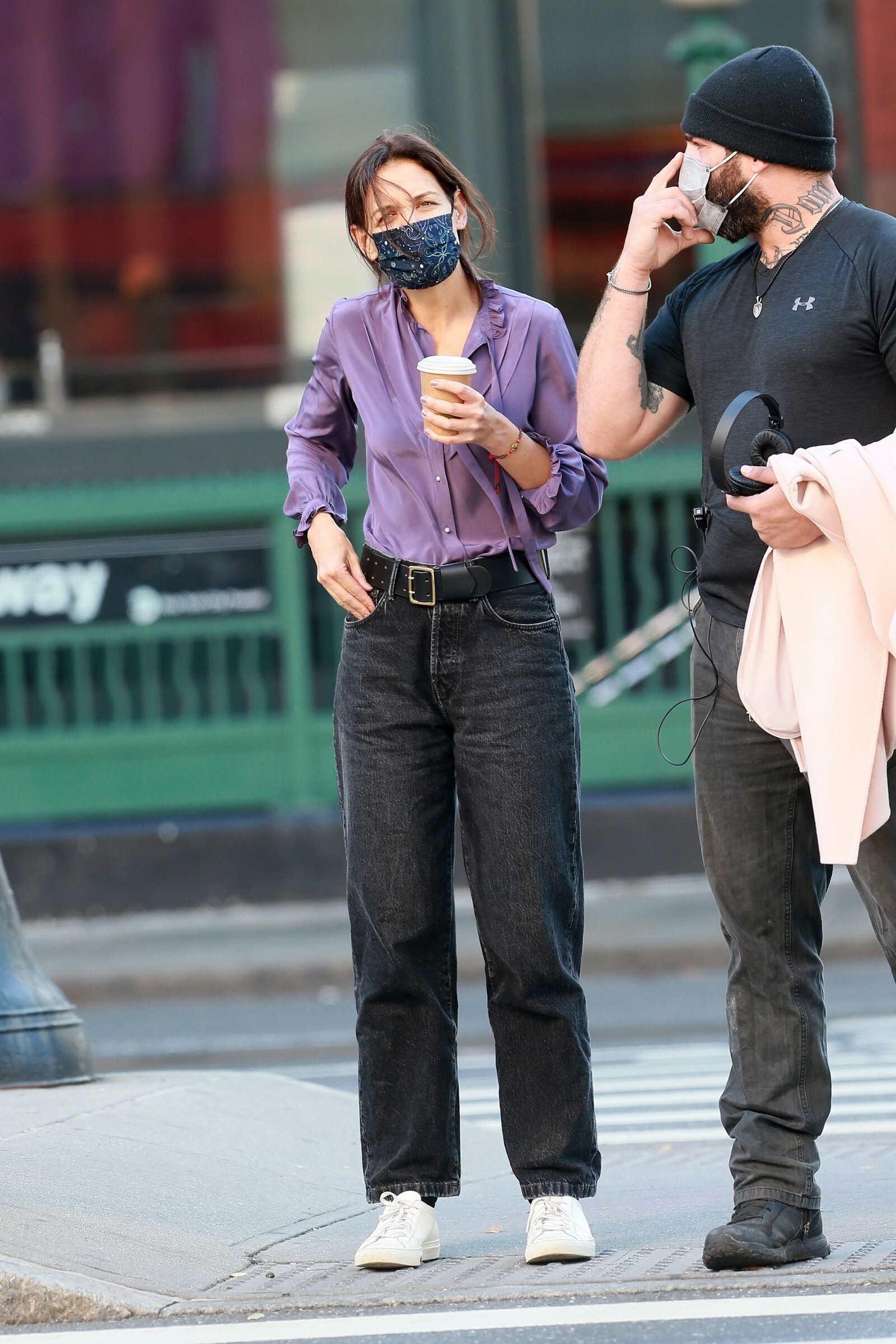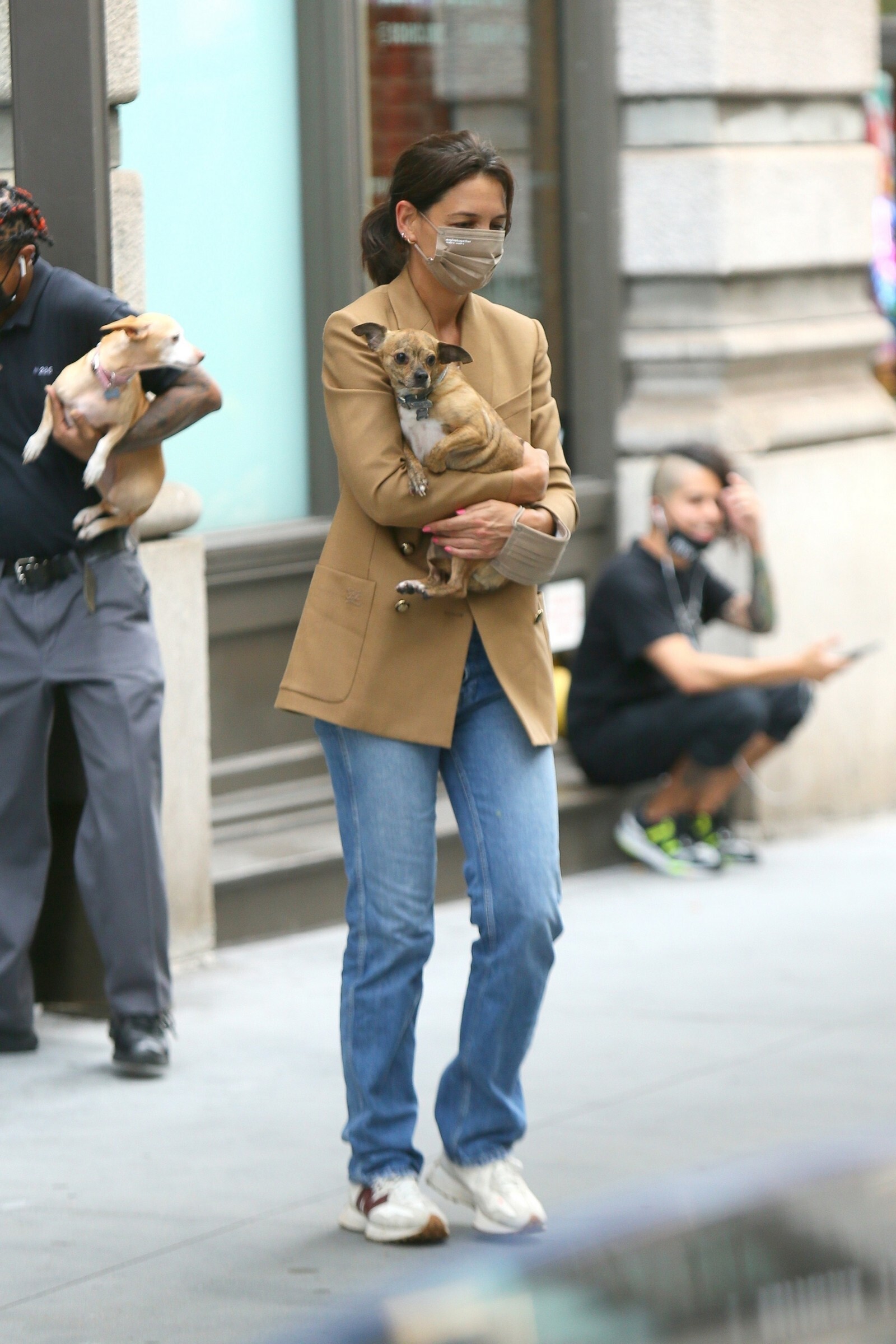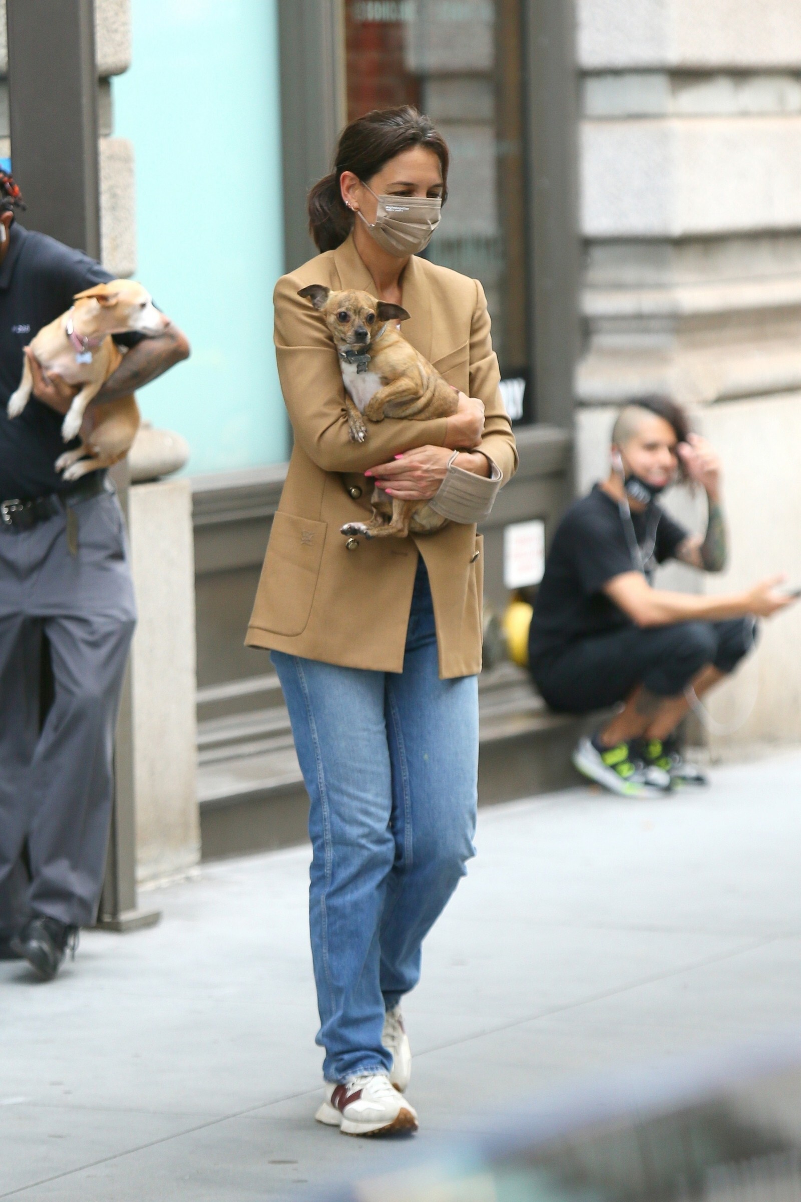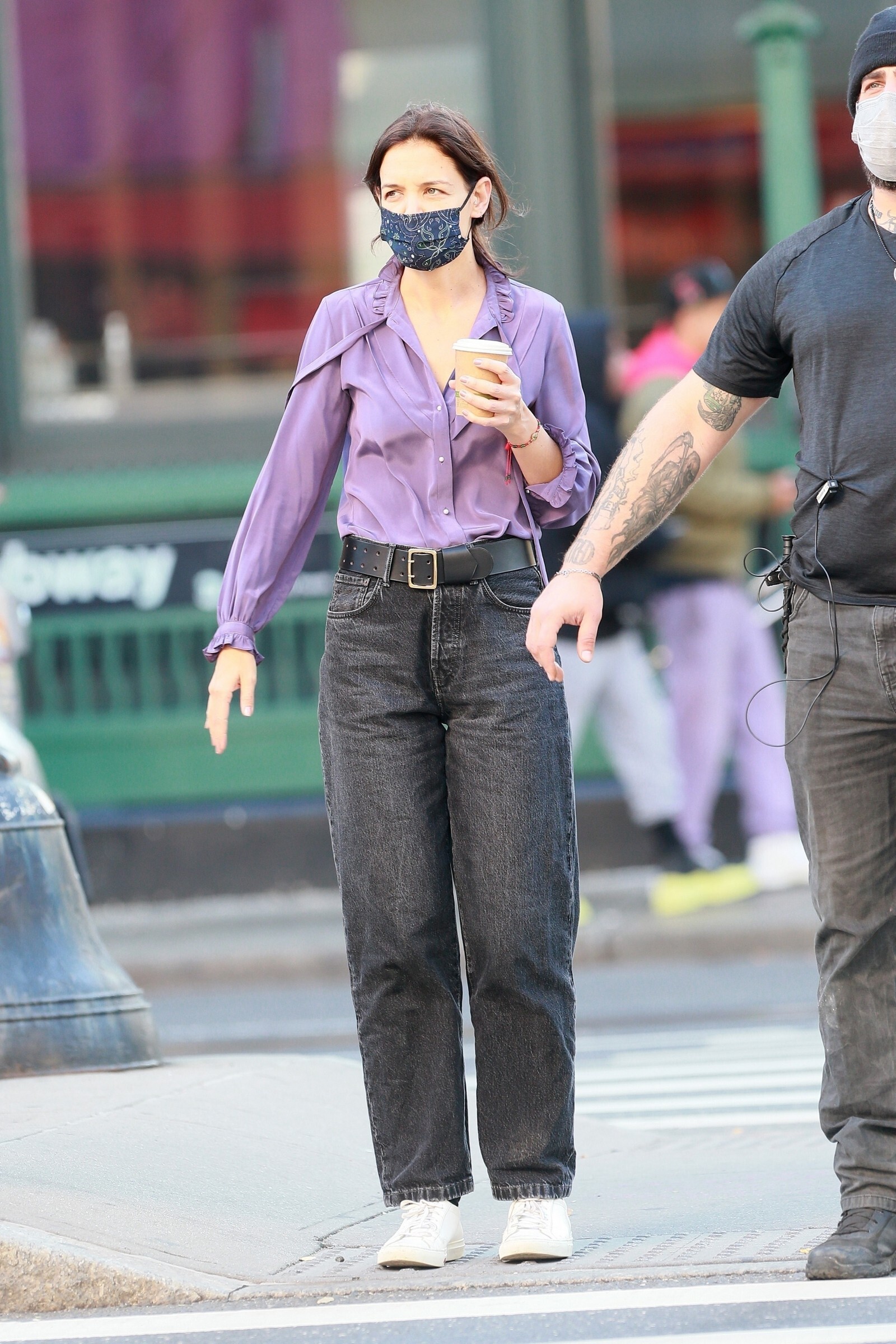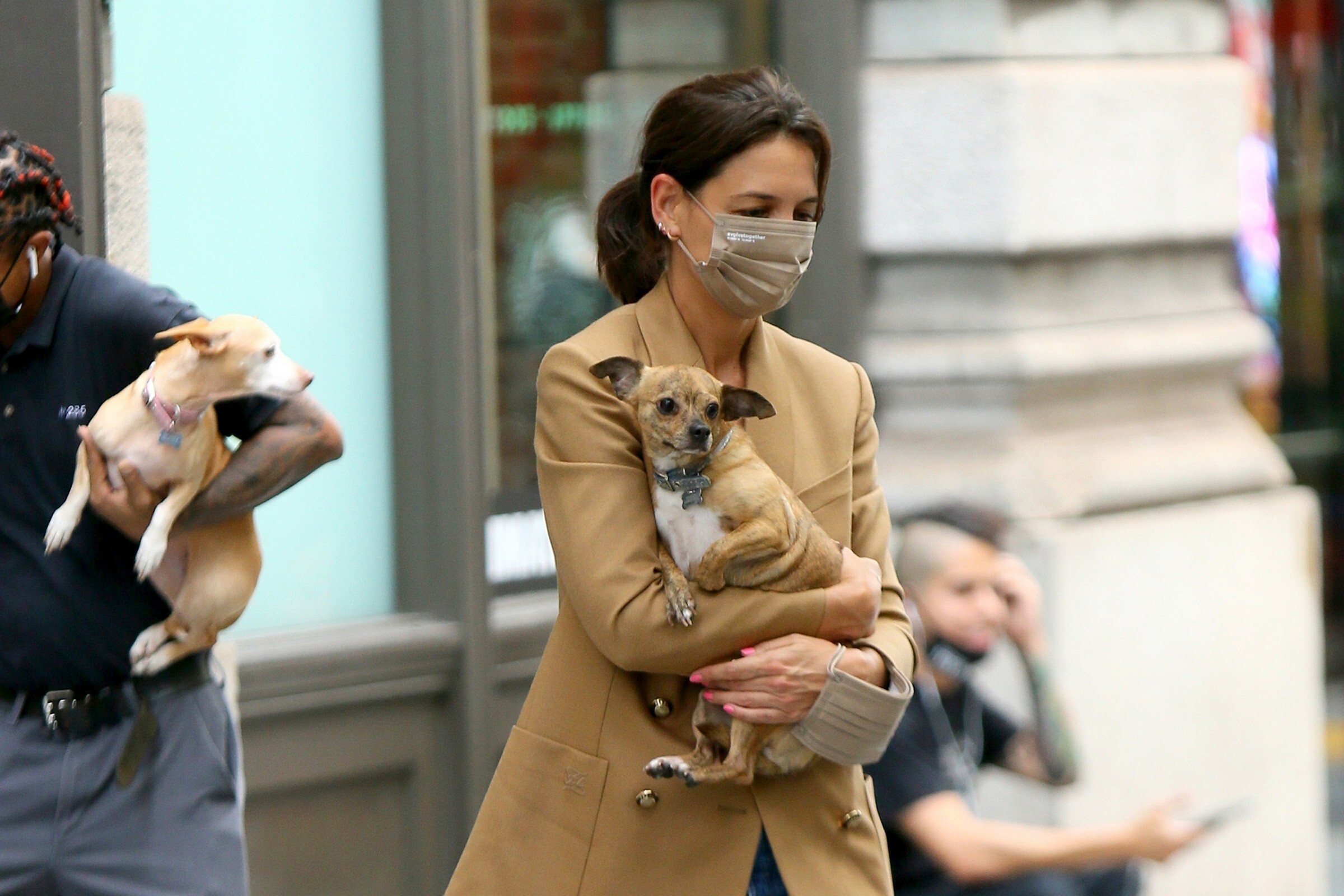 Katie Holmes' bodyguard carries her coat on the NYC set of her third directorial effort, Rare Objects