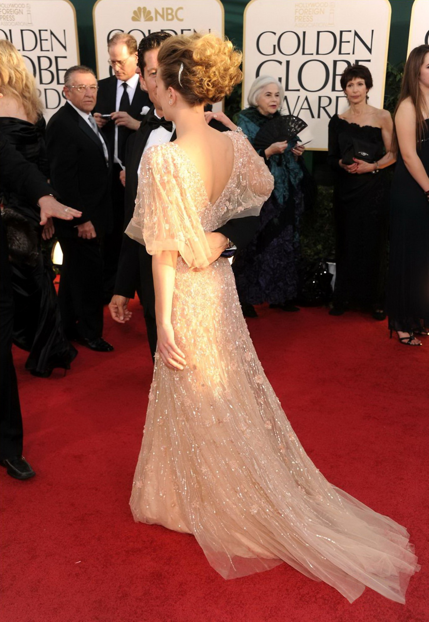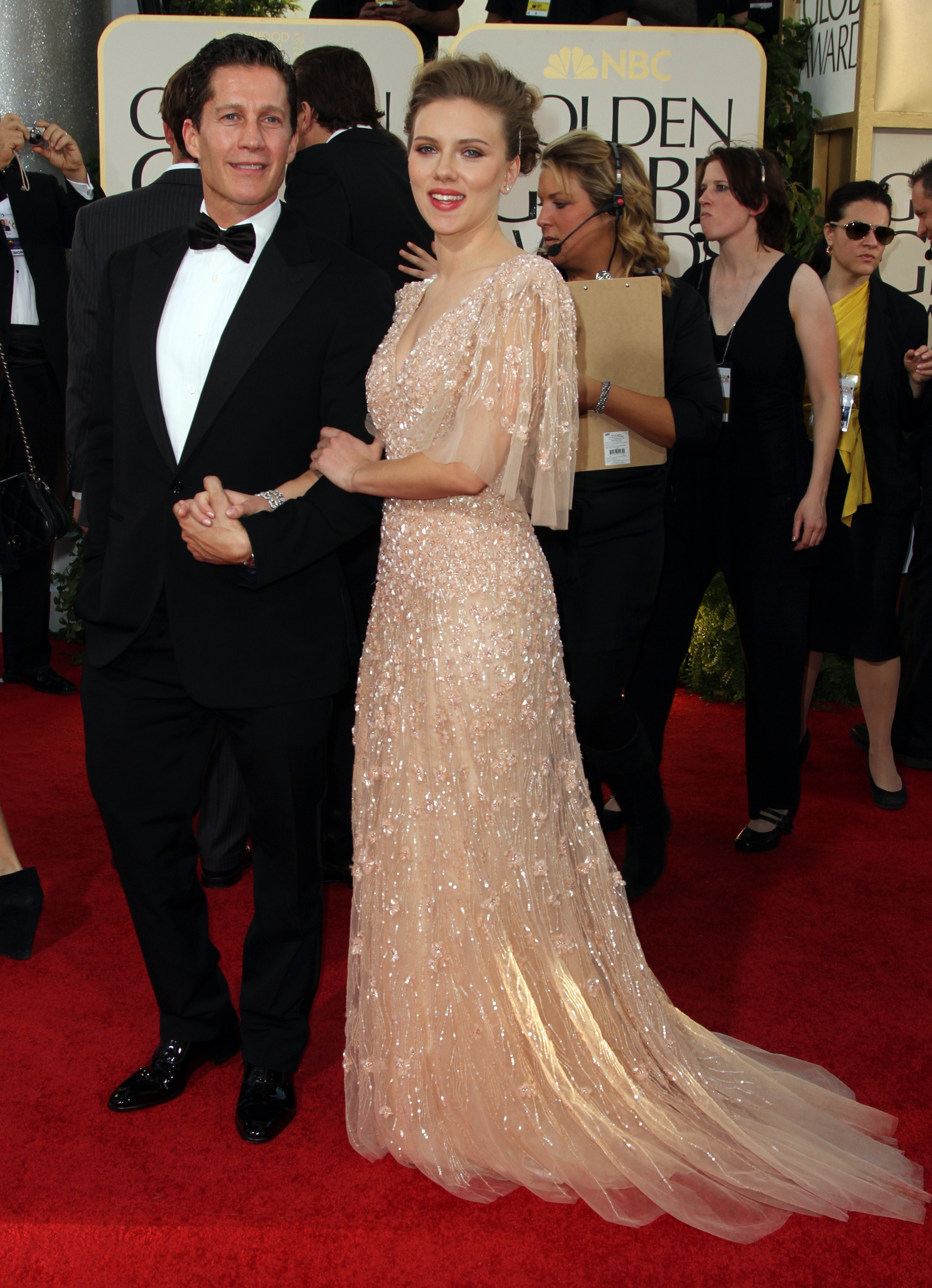 Who is that guy on her arm? I'm not a fan of the dress, she looks like the good witch from Wizard of Oz.