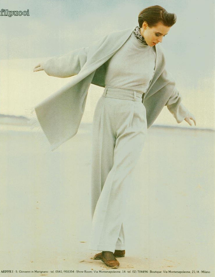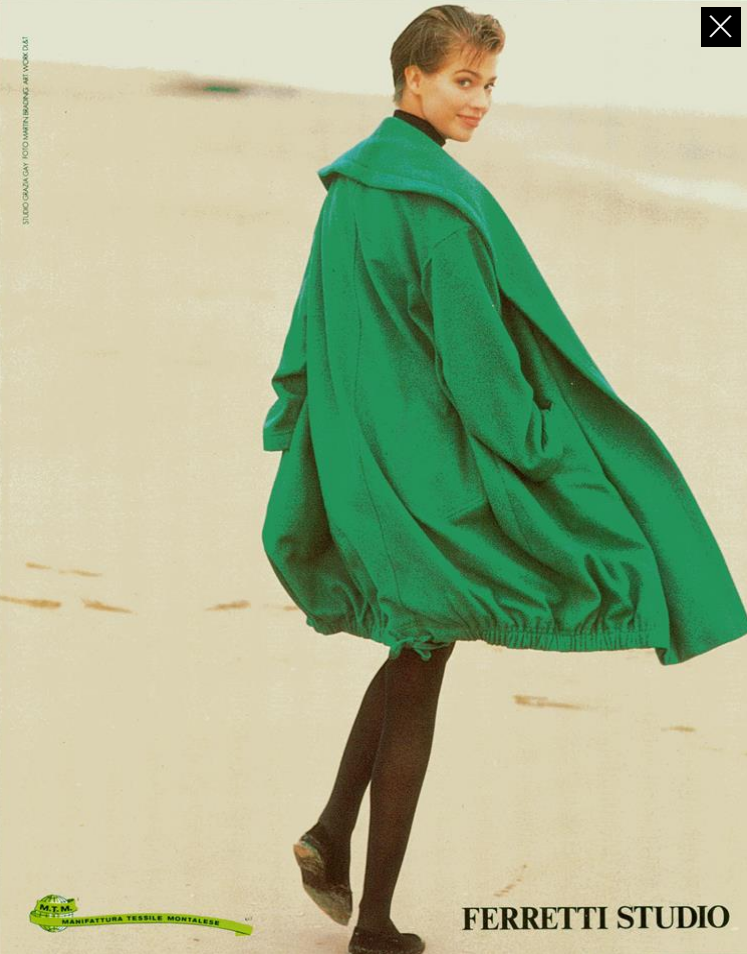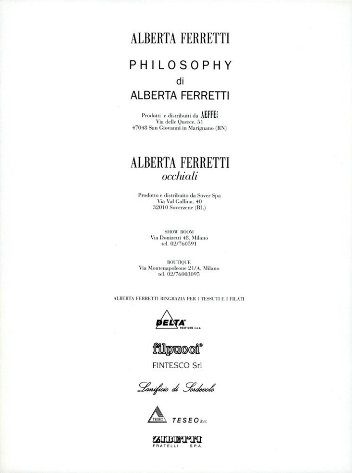 In 1968, Alberta Ferretti opened her first boutique, called Jolly, in Cattolica. She designed a first collection in 1973 and co-founded Aeffe S.p.A [it] (a publicly traded clothing manufacturer and distributor) in 1976. She began showing seasonal collections on the runways of Milan in 1981. She launched Ferretti Jeans Philosophy in 1989, renamed Philosophy di Alberta Ferretti in 1994. In 1994 she renovated a 13th-century castle into the Palazzo Viviani hotel in Montegridolfo.