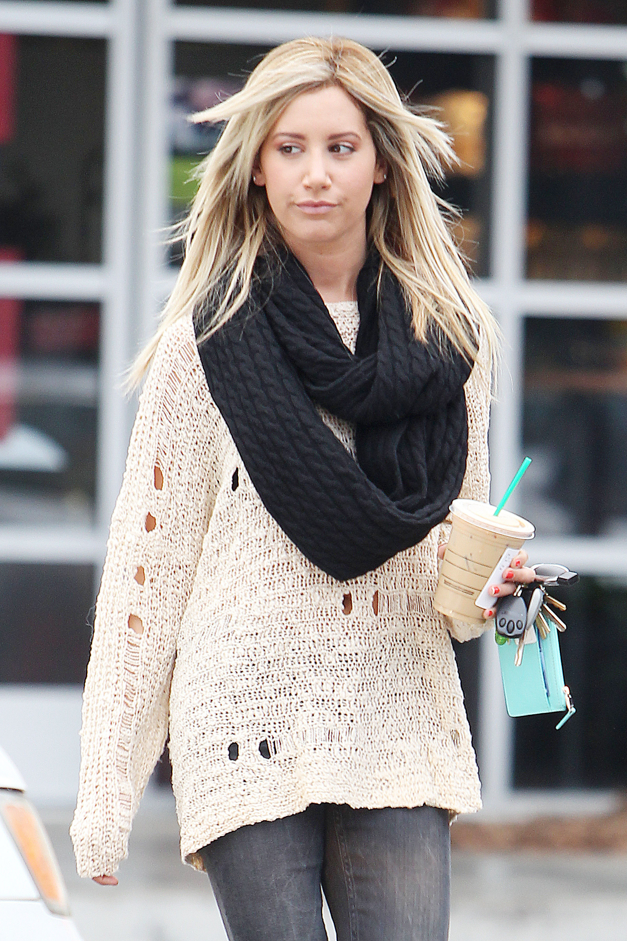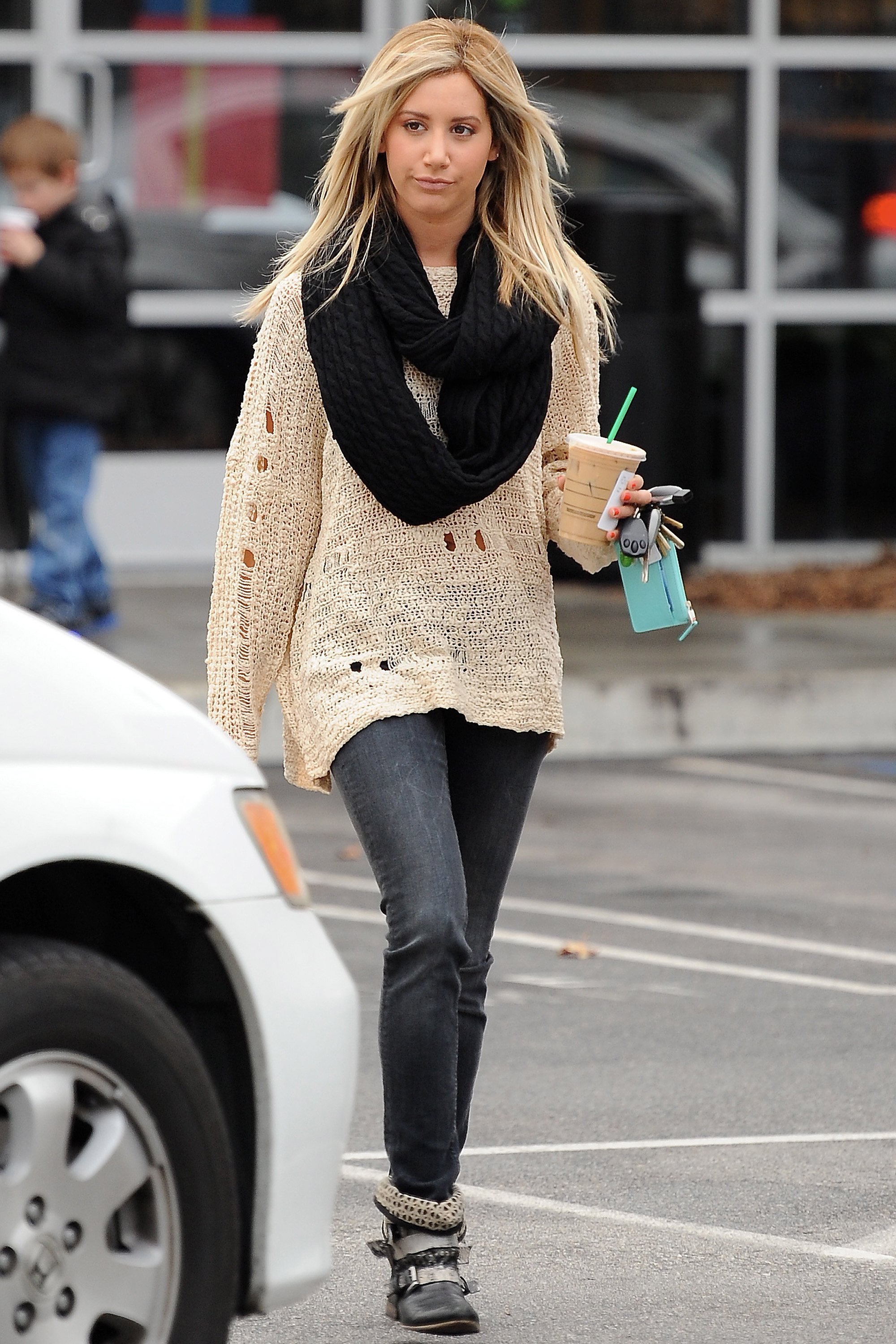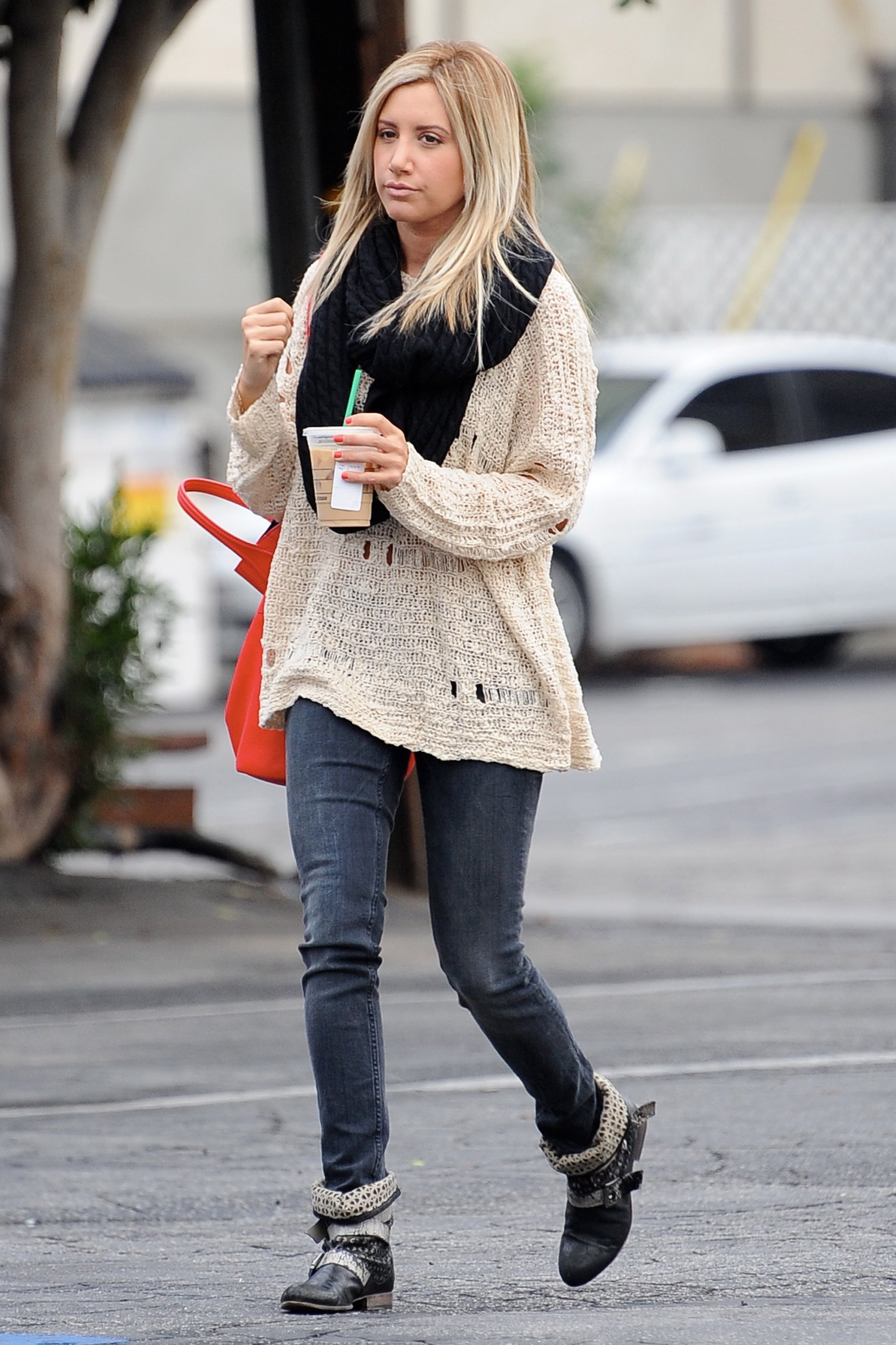 especially the knitted scarf,and her hair with the sweater are amazing,also the bag , adding some color to the outfit. ![]()