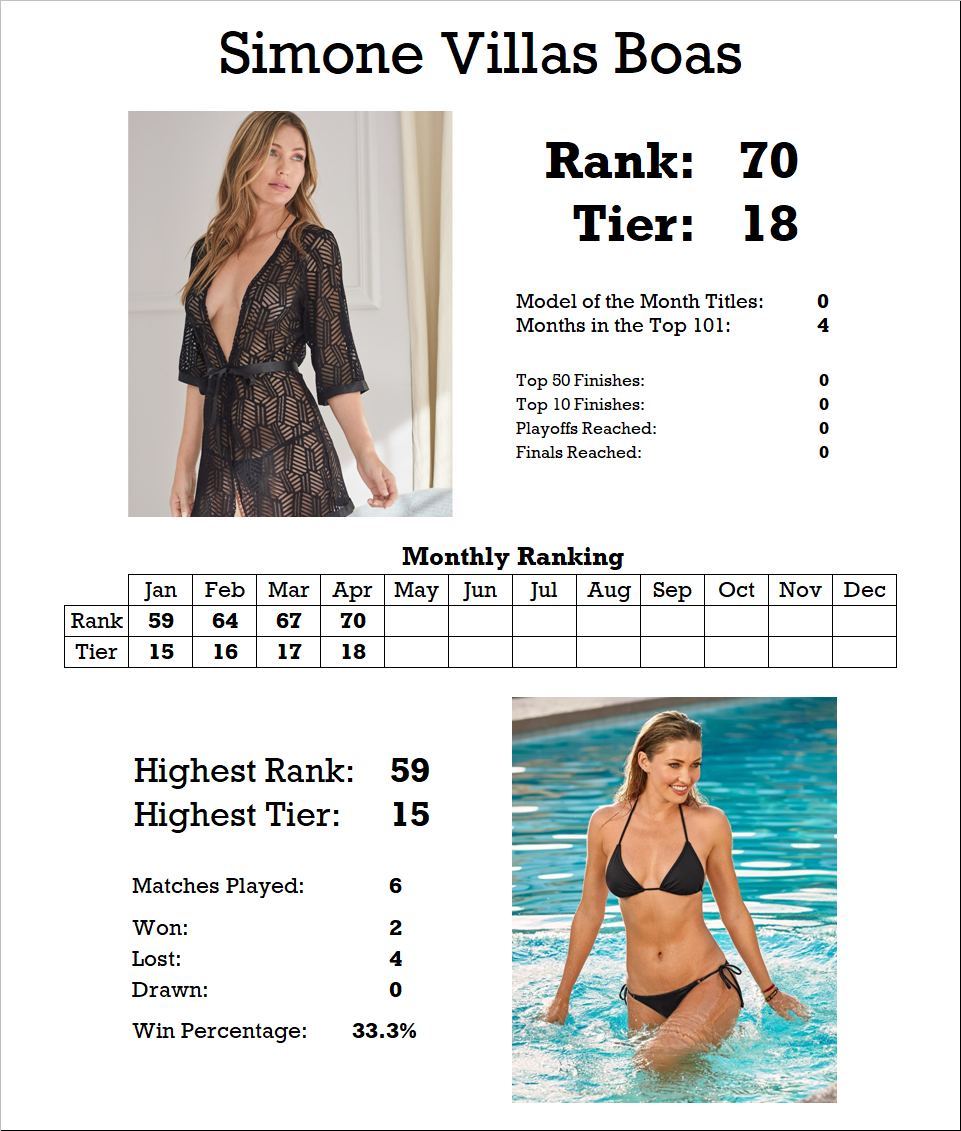 Simone started with a couple of wins in January, but since then has been dropping through the rankings, and overall the models in Tier 18 are struggling to pick up wins at the moment. However the challengers have had some close matches recently, so maybe all that is about to change.