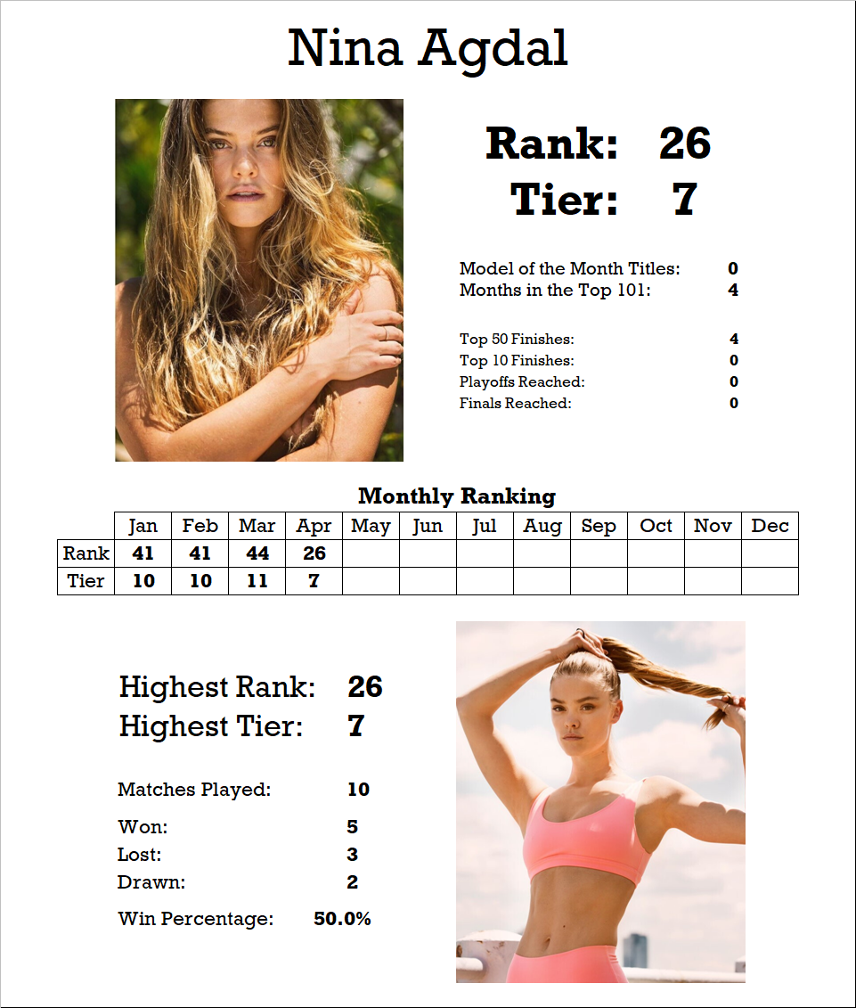 Nina hovered around Tier 10 and 11 for the first few months of the year, but moved up to Tier 7 last month with a good run of victories.