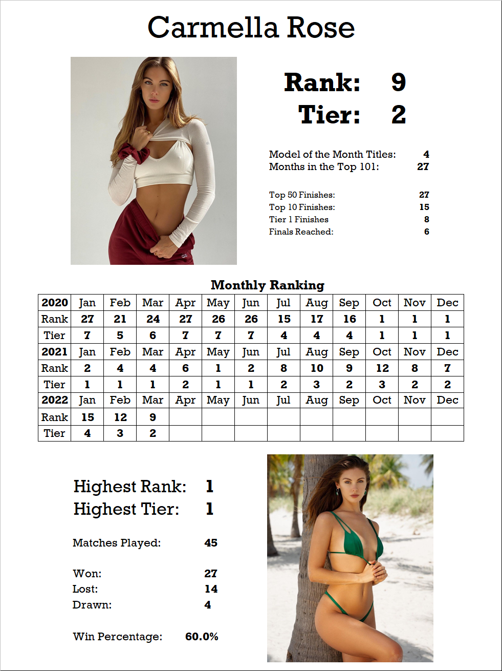 | Barbara Palvin | W | 15 | 6 |