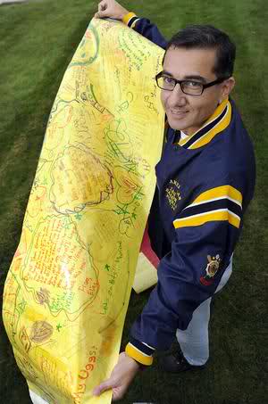 Cameron Middle School science teacher Mark Baptista with a 20-foot laminated letter students will be sending to to Tom Brady and Gisele Bundchen, inviting them to visit their school.