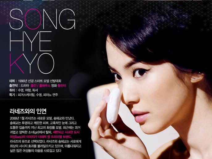 Song Hye Kyo is a South Korean model and actress. Before getting her arts degree at Sejong University, Song made her debut by winning the Grand Prize in model search in SunKyung Smart and starring in a Sunday morning drama called "Happy Morning" (KBS,1996). She starred in number of hit dramas including All In, Autumn Fairy Tale, and Full House. Due to her popularity she can be seen frequently on advertisements when she is not acting. She is currently under SidusHQ.