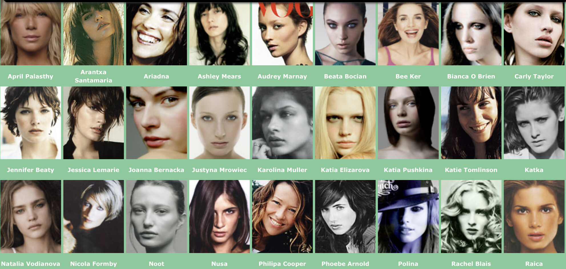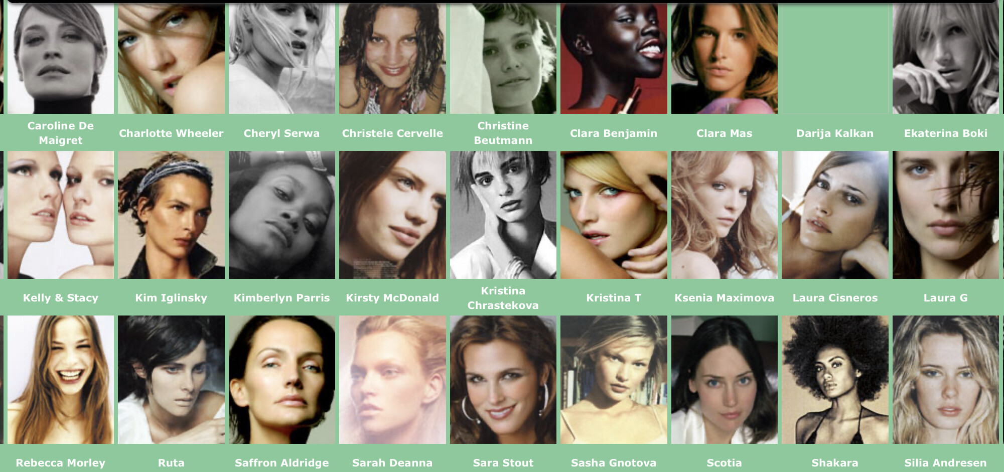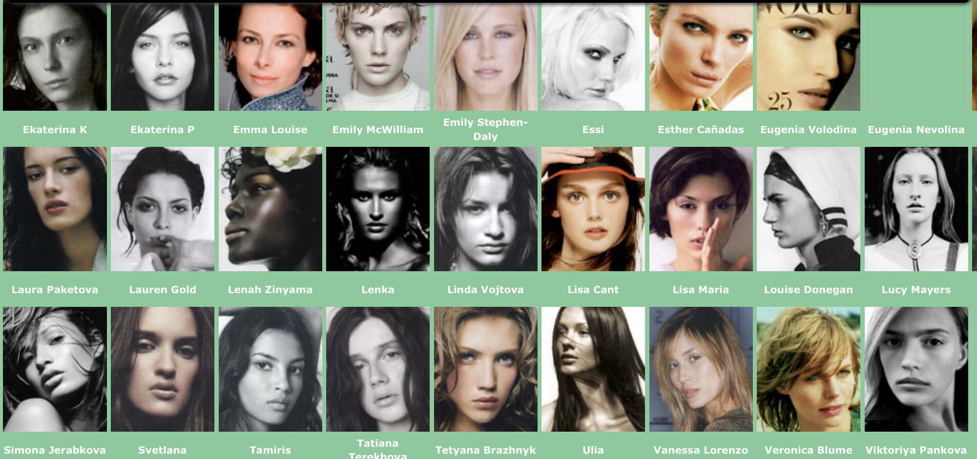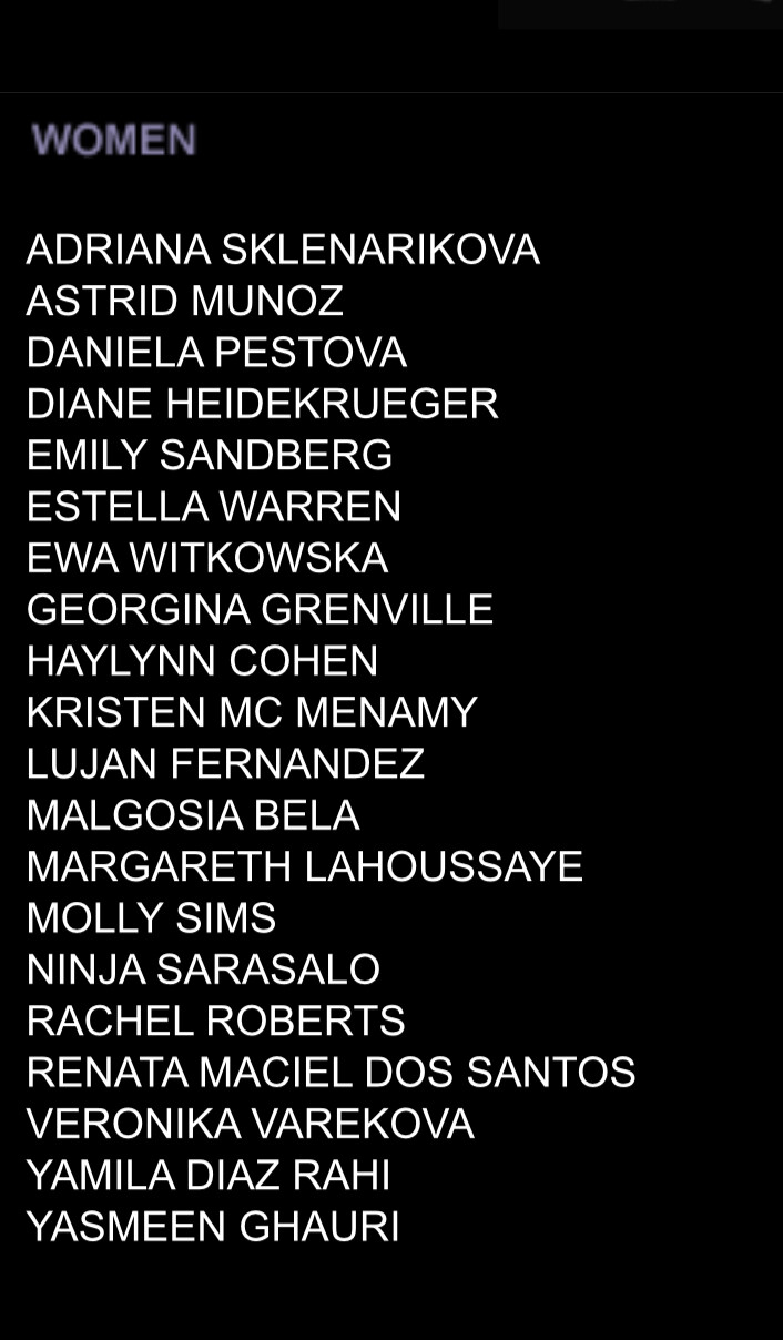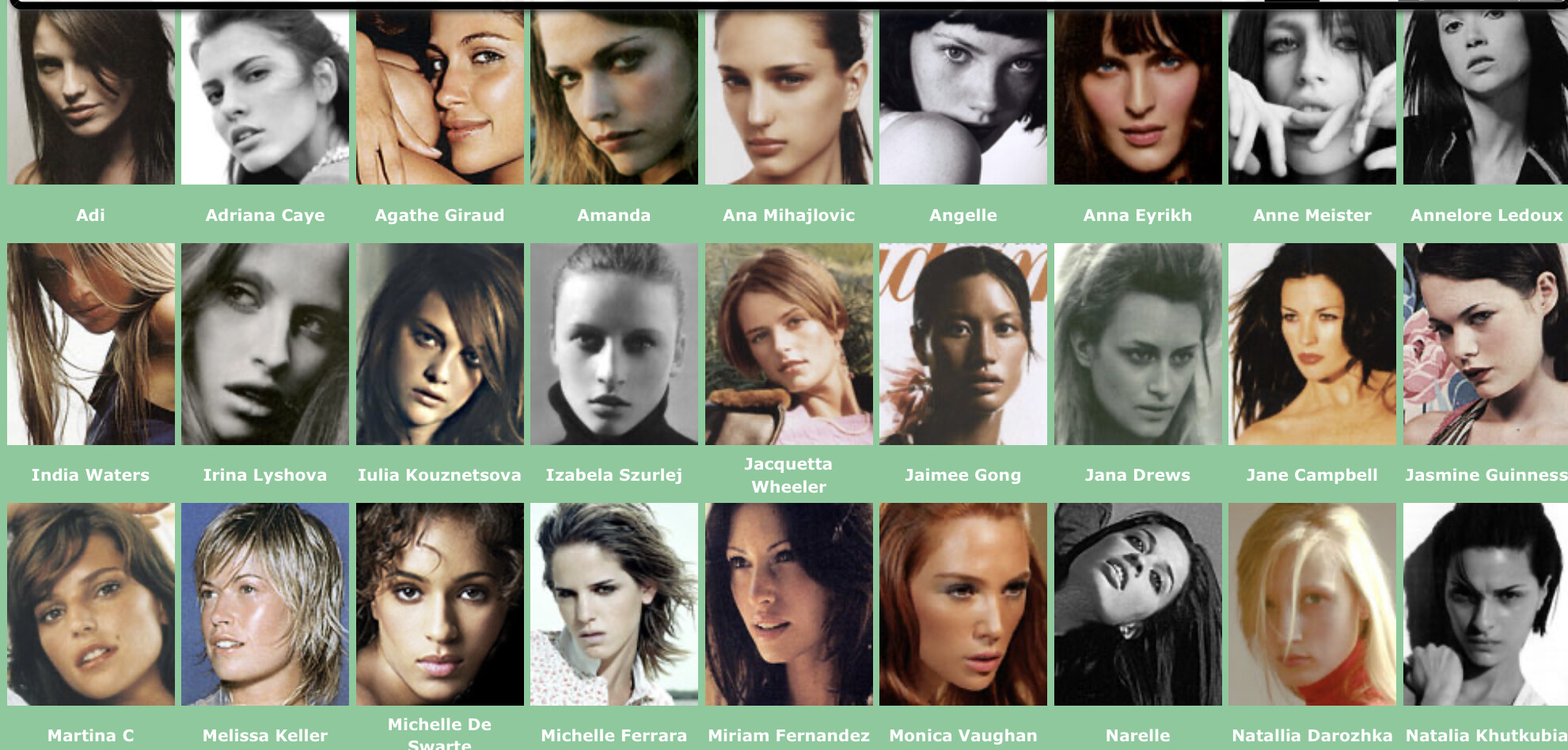 Karen Alexander, Annette, .Stephanie Ansell, Joslyn Baxter, Nicole Beach, Andrea Bergh, Bianca, Gina Cambre, Mary Catherine, Jill Goodacre, Mary Cullen Weeden, Daria, Deanna, Aly Dunne, Jennifer Flavin, Geri, Susan Gin, Gray, Tara Green, Leah Gregory, Lara Harris, Kerri Henderson, Leticia Herrera, Kathy Holliday, Gigi Howard, Jodie Kidd, Jolanda, Karine Katz, Kira, Marlen Koehler, Kristina Kumlin, Laila, Padma Lakshmi, Janna Lapidus, Ling, Louise, Jade Malle, Missy, Nadege, Nessie, Tove Nord, Sarah Olsen, Dana Patrick, Pazit, Jane Powers, Joy Rich, Stephanie Seympur, Shana Zadrick, Tatiana Sorokko, Claudya Speidel, Tasha, Krissy Taylor, Karen Travis, Kaaren V, Varine, Nasdeja Vassilieva, Marleen Vatne, Yvonne.