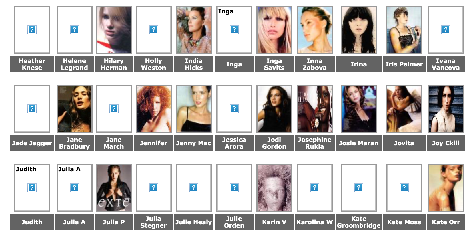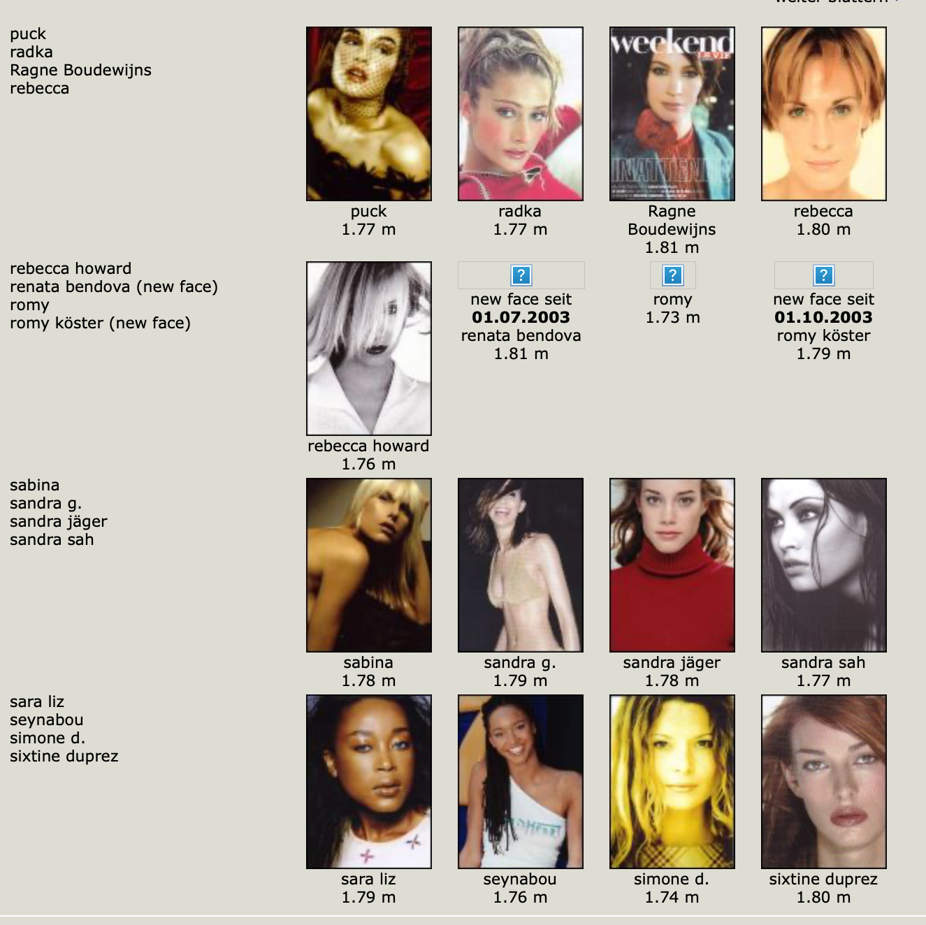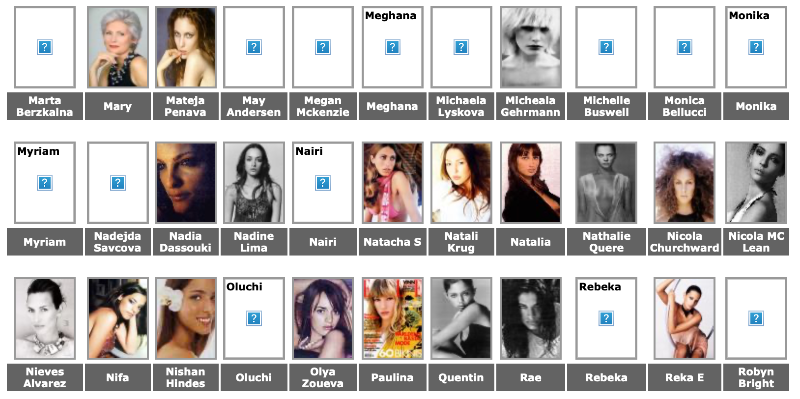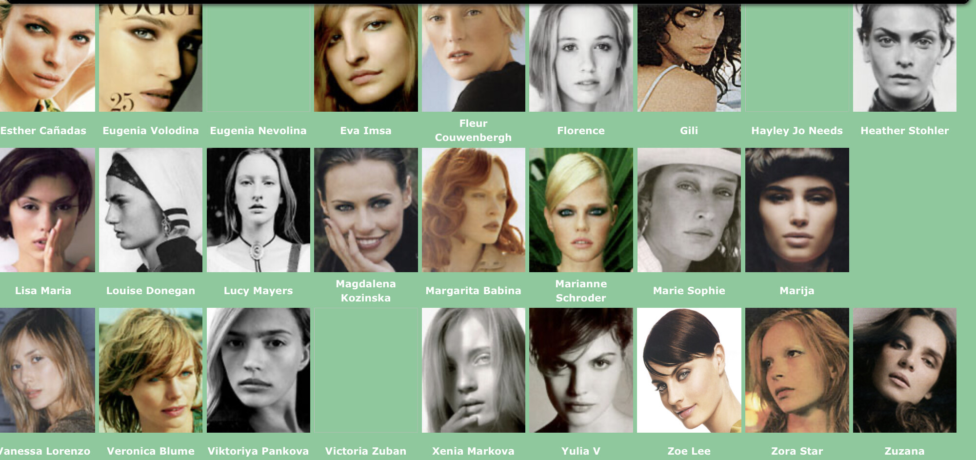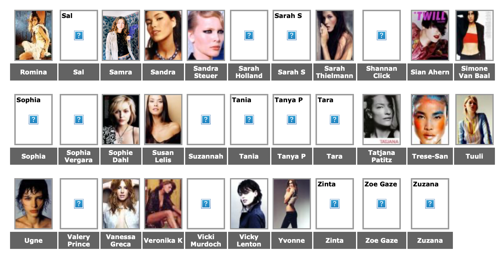 Karen Alexander, Annette, .Stephanie Ansell, Joslyn Baxter, Nicole Beach, Andrea Bergh, Bianca, Gina Cambre, Mary Catherine, Jill Goodacre, Mary Cullen Weeden, Daria, Deanna, Aly Dunne, Jennifer Flavin, Geri, Susan Gin, Gray, Tara Green, Leah Gregory, Lara Harris, Kerri Henderson, Leticia Herrera, Kathy Holliday, Gigi Howard, Jodie Kidd, Jolanda, Karine Katz, Kira, Marlen Koehler, Kristina Kumlin, Laila, Padma Lakshmi, Janna Lapidus, Ling, Louise, Jade Malle, Missy, Nadege, Nessie, Tove Nord, Sarah Olsen, Dana Patrick, Pazit, Jane Powers, Joy Rich, Stephanie Seympur, Shana Zadrick, Tatiana Sorokko, Claudya Speidel, Tasha, Krissy Taylor, Karen Travis, Kaaren V, Varine, Nasdeja Vassilieva, Marleen Vatne, Yvonne.