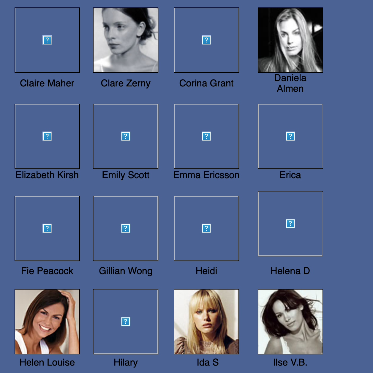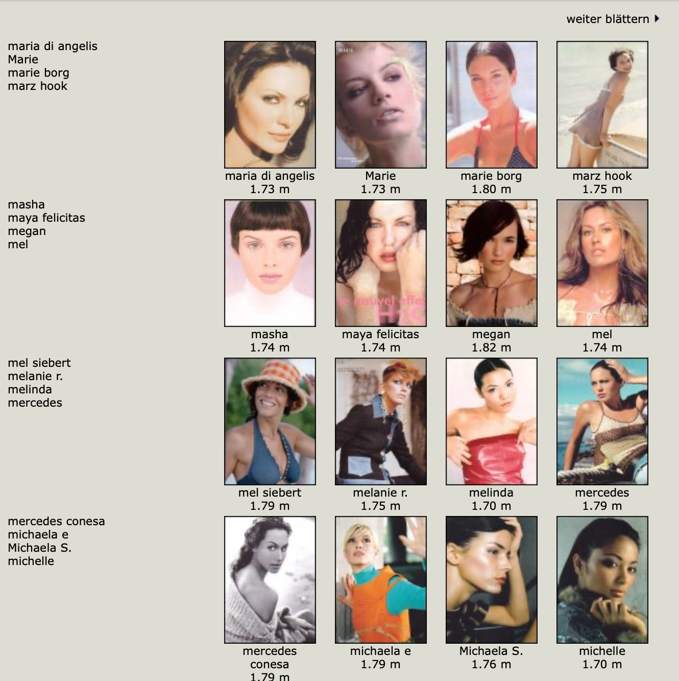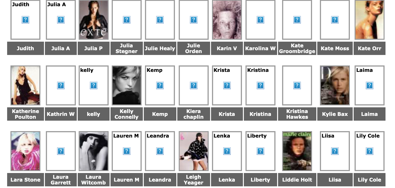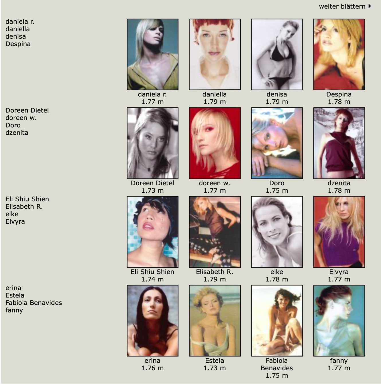 Karen Alexander, Annette, .Stephanie Ansell, Joslyn Baxter, Nicole Beach, Andrea Bergh, Bianca, Gina Cambre, Mary Catherine, Jill Goodacre, Mary Cullen Weeden, Daria, Deanna, Aly Dunne, Jennifer Flavin, Geri, Susan Gin, Gray, Tara Green, Leah Gregory, Lara Harris, Kerri Henderson, Leticia Herrera, Kathy Holliday, Gigi Howard, Jodie Kidd, Jolanda, Karine Katz, Kira, Marlen Koehler, Kristina Kumlin, Laila, Padma Lakshmi, Janna Lapidus, Ling, Louise, Jade Malle, Missy, Nadege, Nessie, Tove Nord, Sarah Olsen, Dana Patrick, Pazit, Jane Powers, Joy Rich, Stephanie Seympur, Shana Zadrick, Tatiana Sorokko, Claudya Speidel, Tasha, Krissy Taylor, Karen Travis, Kaaren V, Varine, Nasdeja Vassilieva, Marleen Vatne, Yvonne.