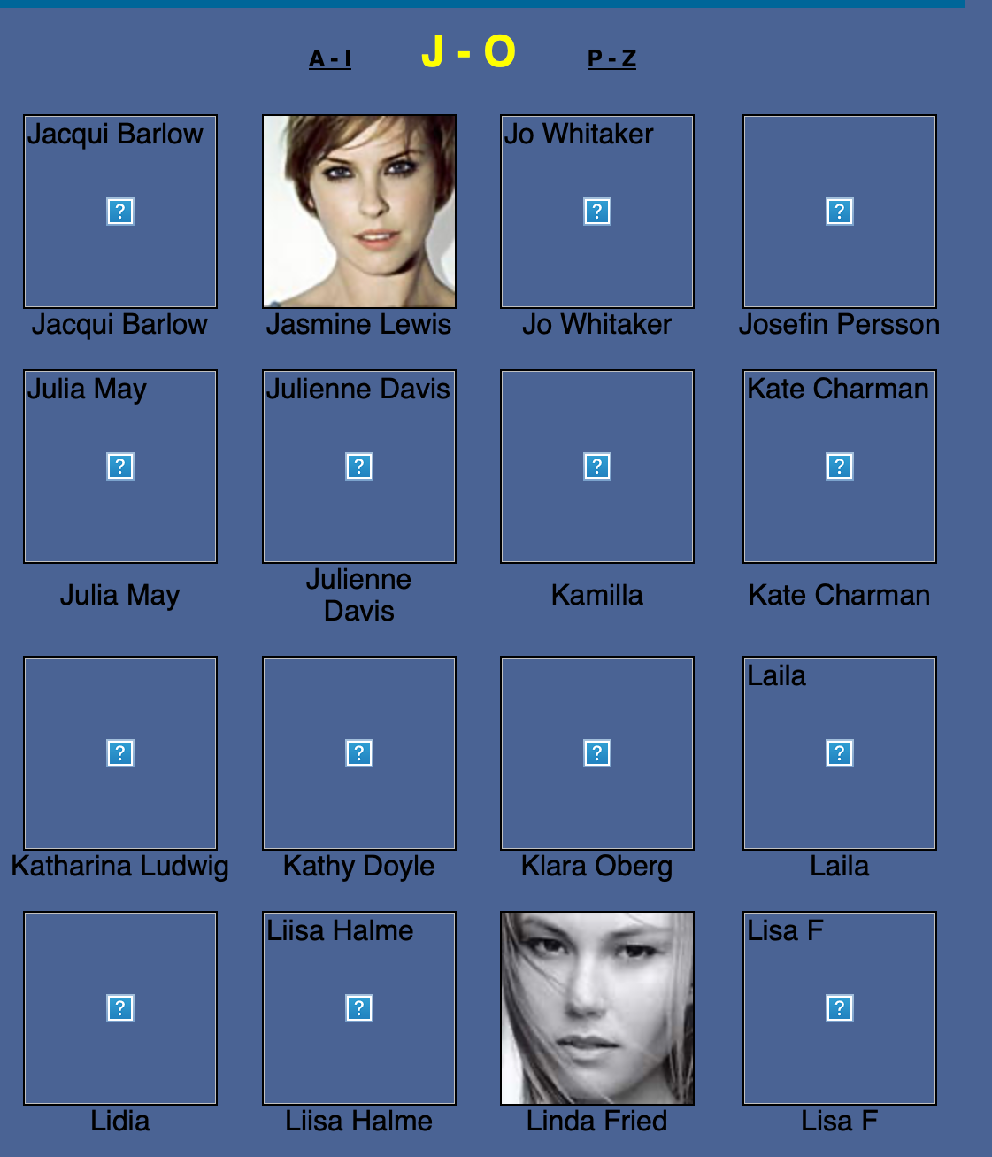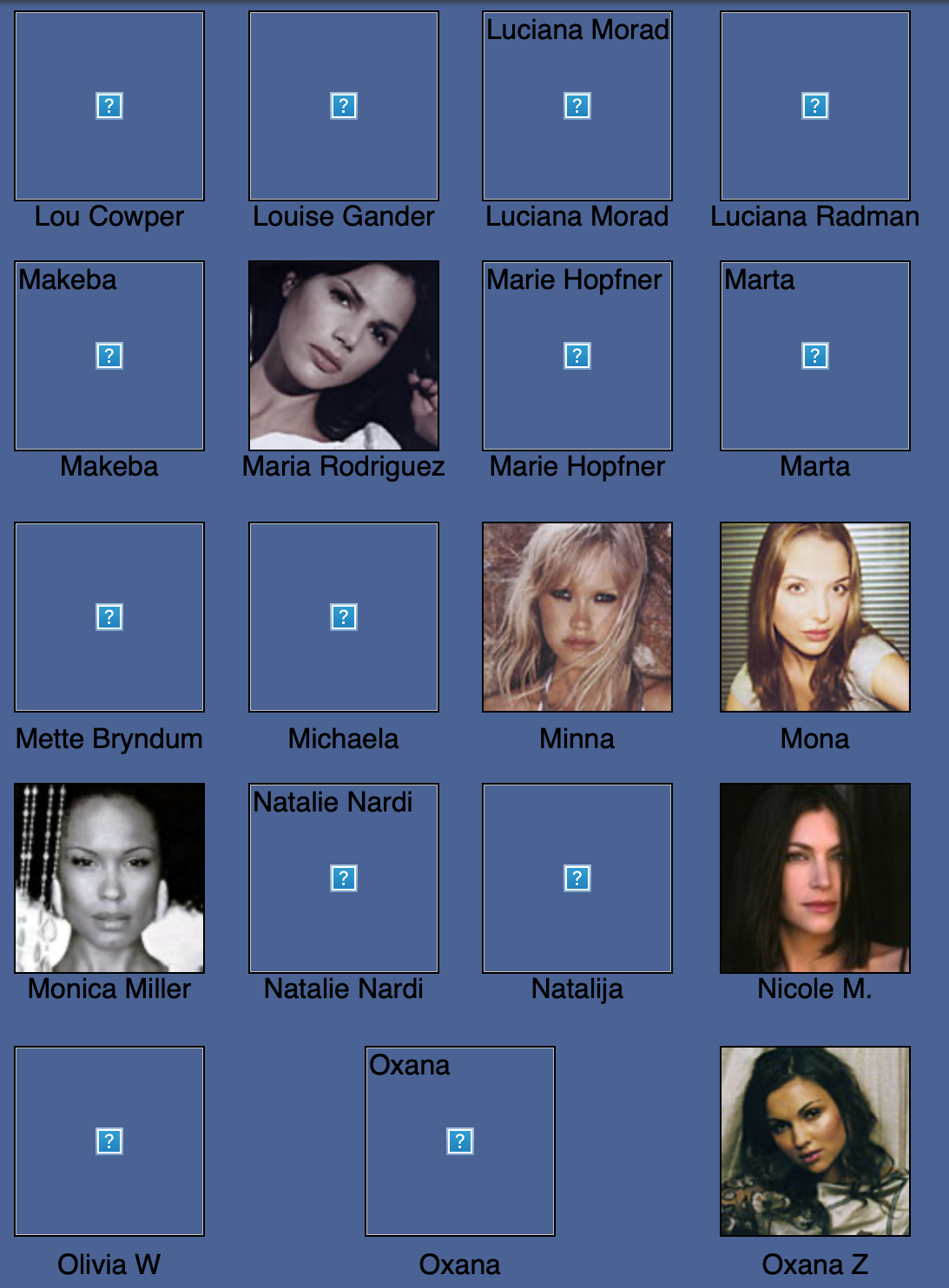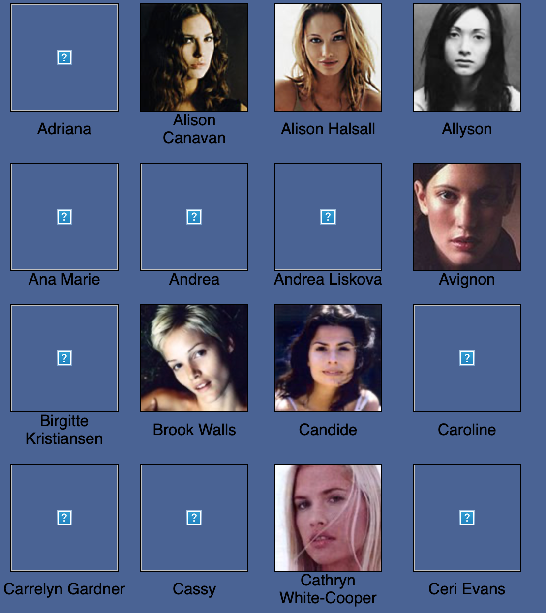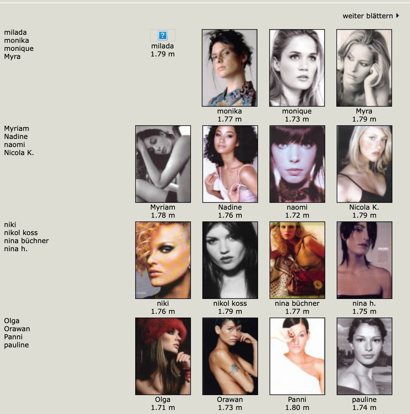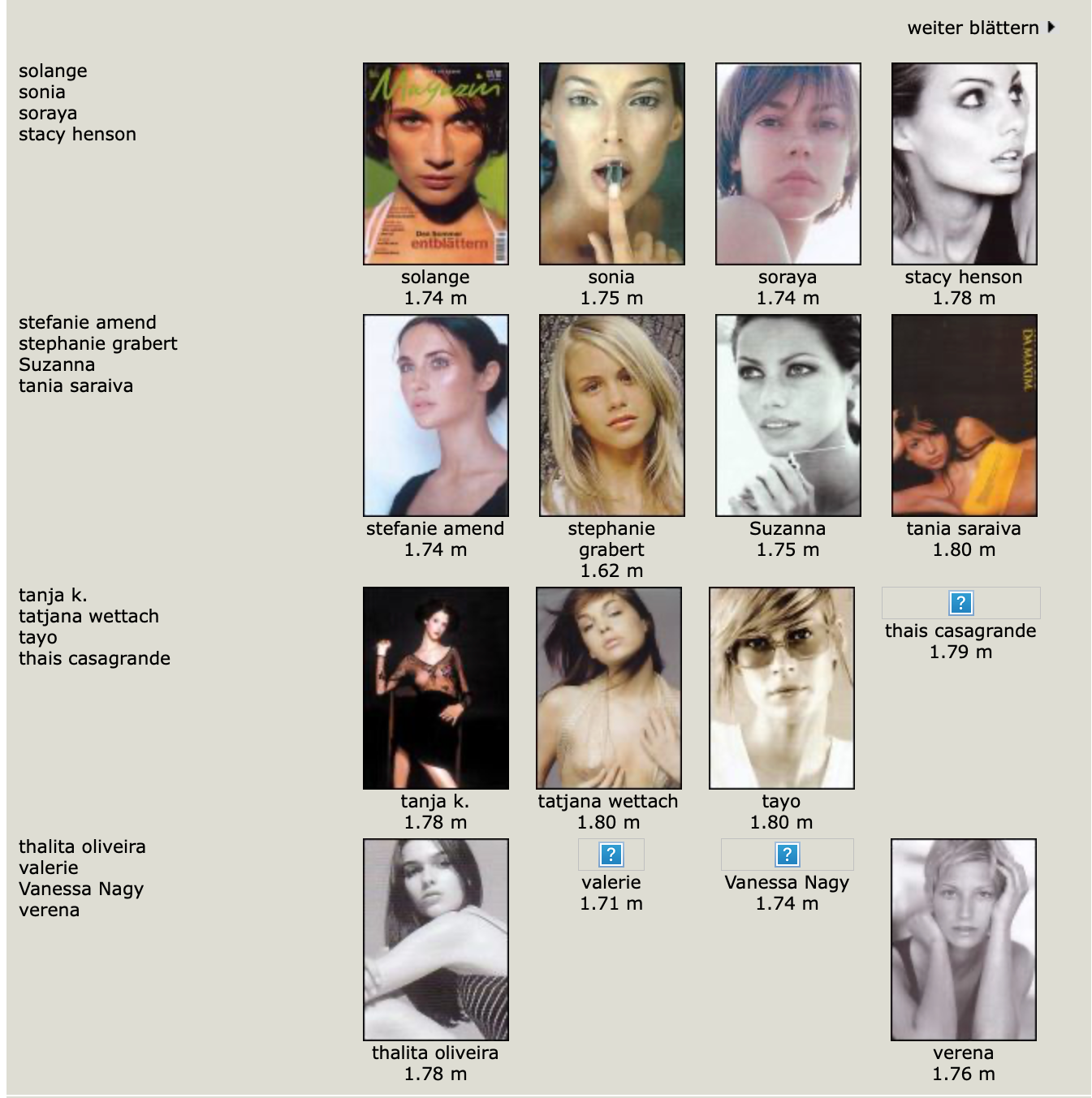 Karen Alexander, Annette, .Stephanie Ansell, Joslyn Baxter, Nicole Beach, Andrea Bergh, Bianca, Gina Cambre, Mary Catherine, Jill Goodacre, Mary Cullen Weeden, Daria, Deanna, Aly Dunne, Jennifer Flavin, Geri, Susan Gin, Gray, Tara Green, Leah Gregory, Lara Harris, Kerri Henderson, Leticia Herrera, Kathy Holliday, Gigi Howard, Jodie Kidd, Jolanda, Karine Katz, Kira, Marlen Koehler, Kristina Kumlin, Laila, Padma Lakshmi, Janna Lapidus, Ling, Louise, Jade Malle, Missy, Nadege, Nessie, Tove Nord, Sarah Olsen, Dana Patrick, Pazit, Jane Powers, Joy Rich, Stephanie Seympur, Shana Zadrick, Tatiana Sorokko, Claudya Speidel, Tasha, Krissy Taylor, Karen Travis, Kaaren V, Varine, Nasdeja Vassilieva, Marleen Vatne, Yvonne.