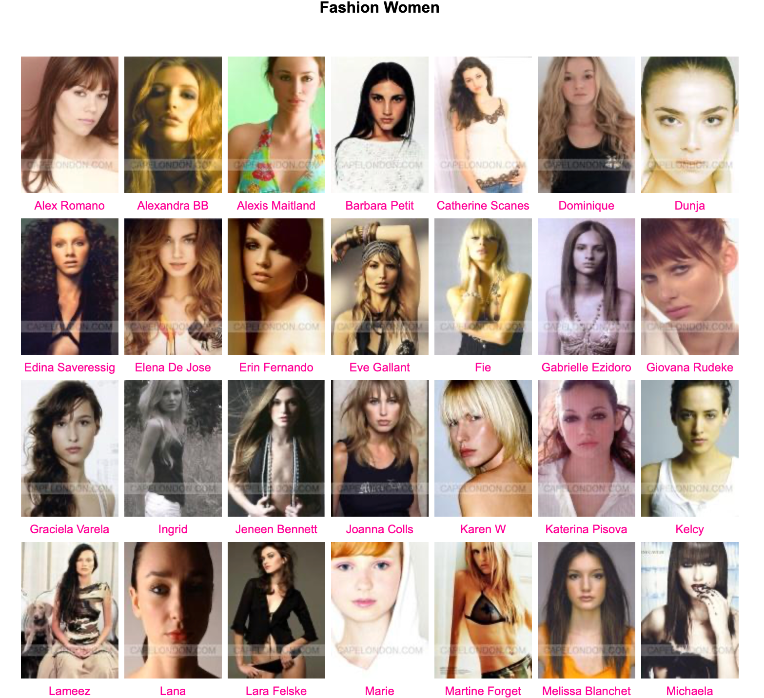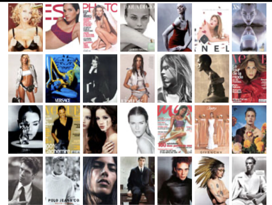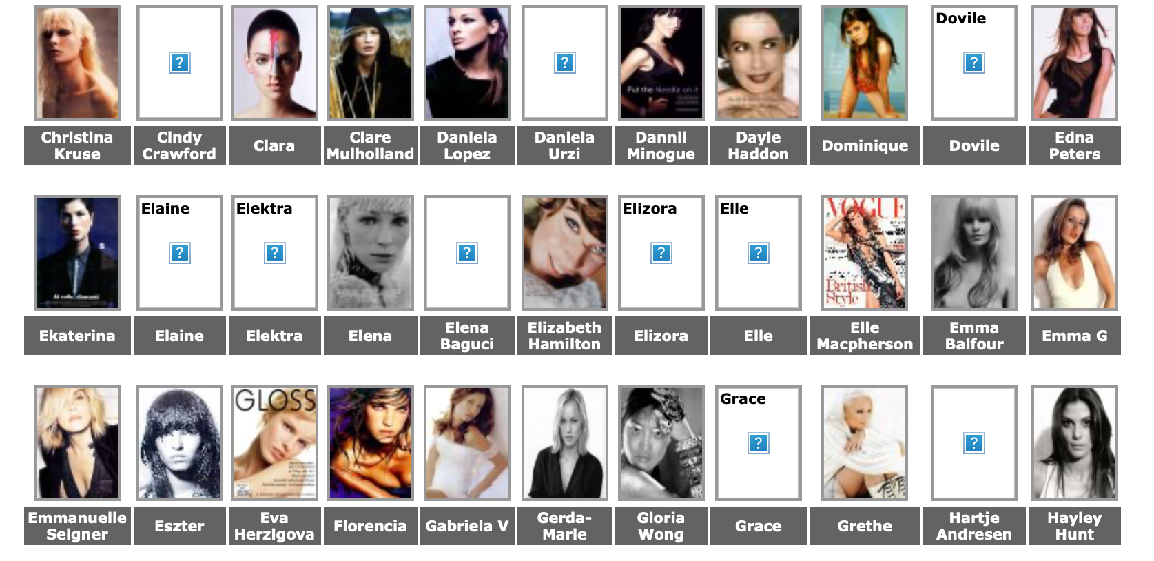Female Models: Amber Valetta, Angelika Kallio, Anika Friebe, Beverly Peele, Cecilia Chancellor, Cindy Crawford, Claudia Mason, Dana Douglas, Diane Heidkrueger (Diane Kruger), Emma Sjoberg, Gail Elliot, Heather Stewart-Whyte, Ines Rivero, Isabella Rossellini, Janine Giddings, Joanna Rhodes, Karen Mulder, Kati Tastet, Keri Claussen, Kim Renneberg, Kirsty Hume, Kristen McMenamy, Linda Evangelista, Lorraine Pascale, Lynsey Parker, Meghan Douglas, Nadja Auermann, Naomi Campbell, Olga Pantushenkova, Patricia Hartmann, Rosemarie Wetzel, Rosemary Ferguson, Shalom Harlow, Simonetta Gianfelici, Susan Holmes, Tatiana Zavialova, Tatjana Patitz, Tereza Maxova, Tricia Helfer, Valerie Jean, Wendy Veldhuis, Yasmin Le Bon, .