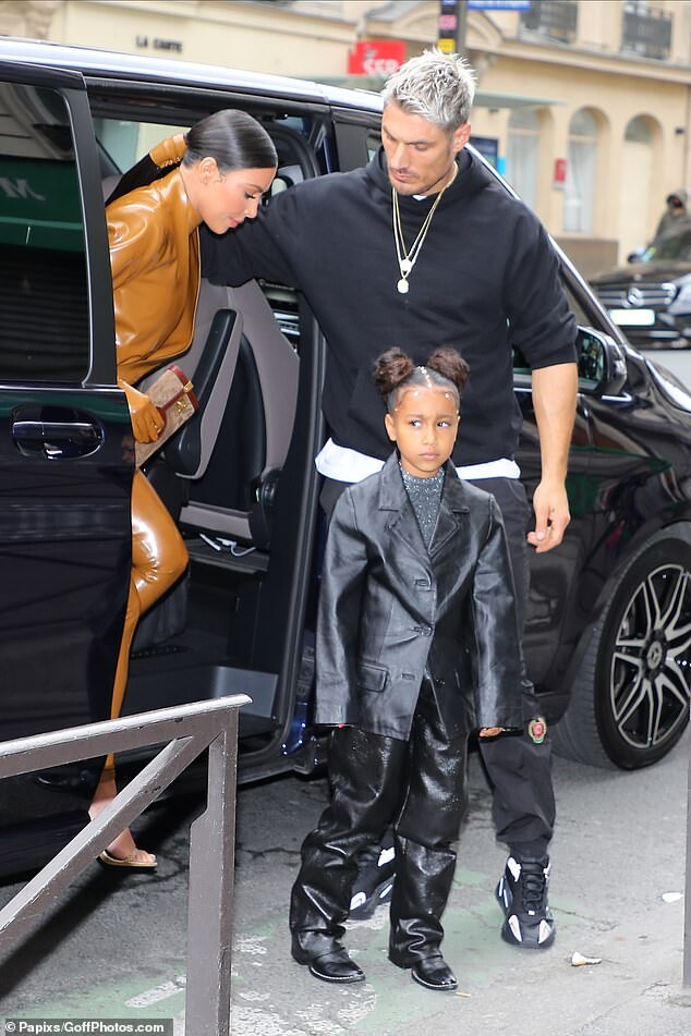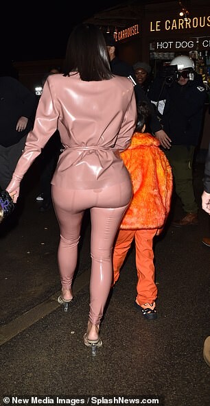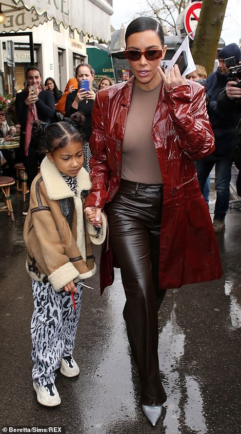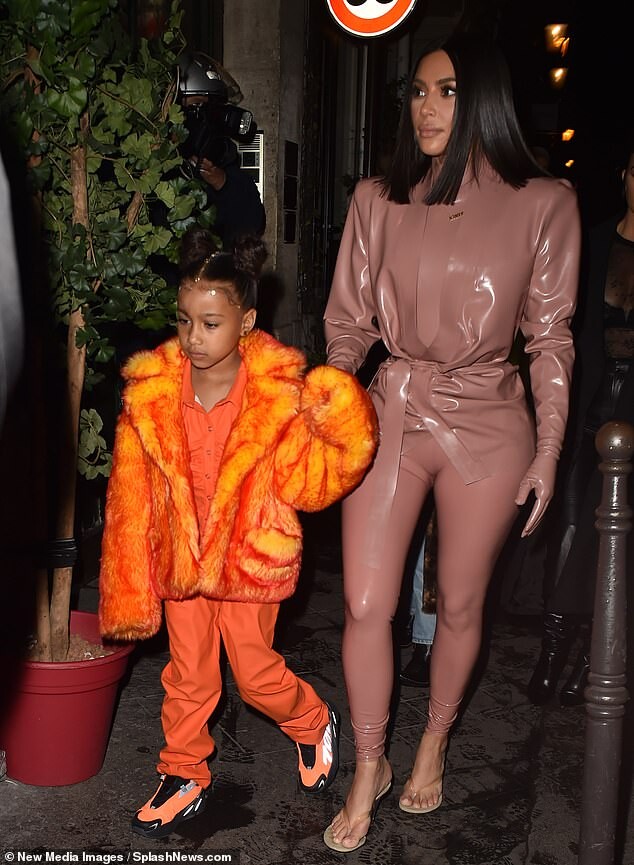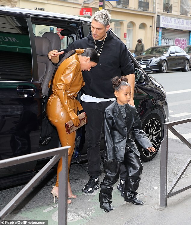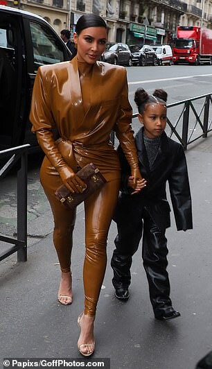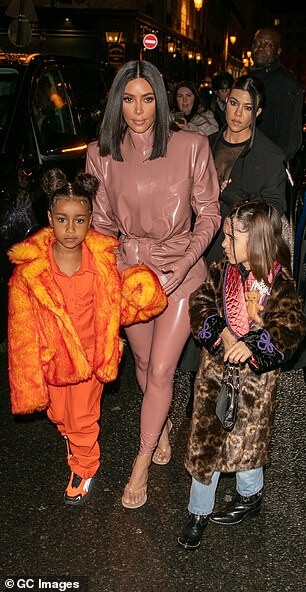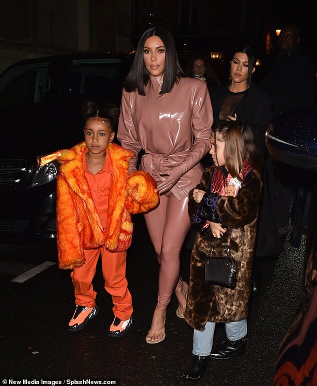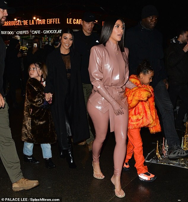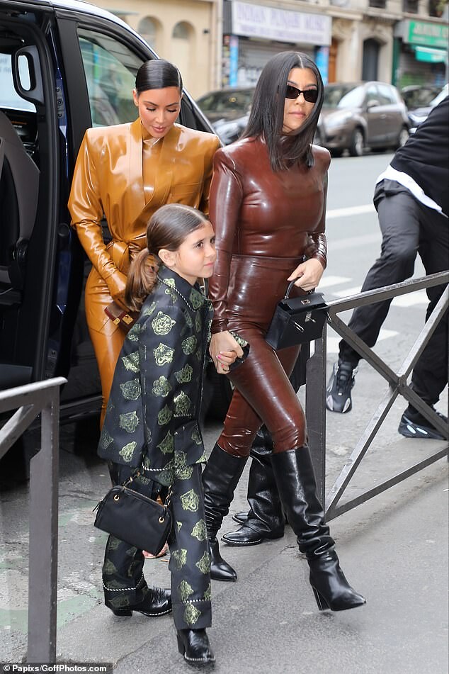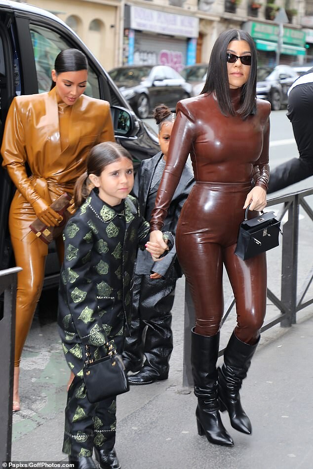 Kourtney Kardashian dons skintight burgundy latex outfit as she is joined by daughter Penelope, seven, and sister Kim for Kanye West's religious Sunday Service in Paris