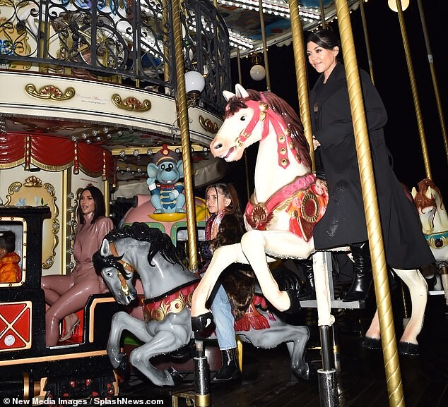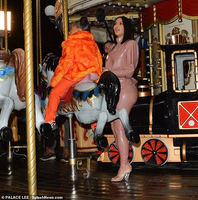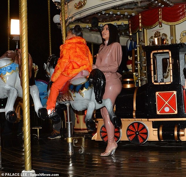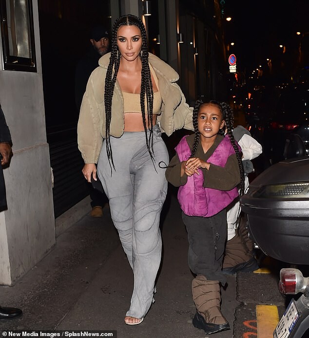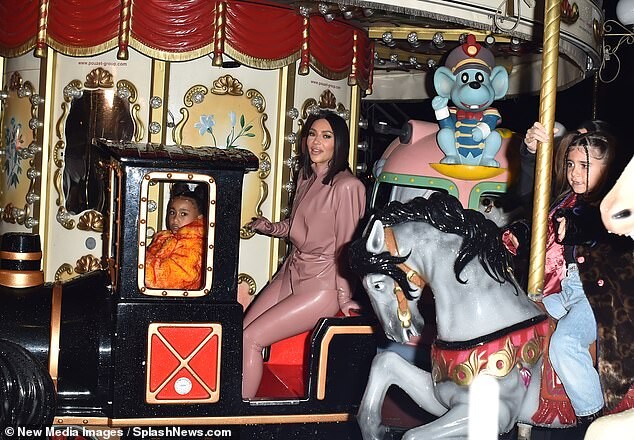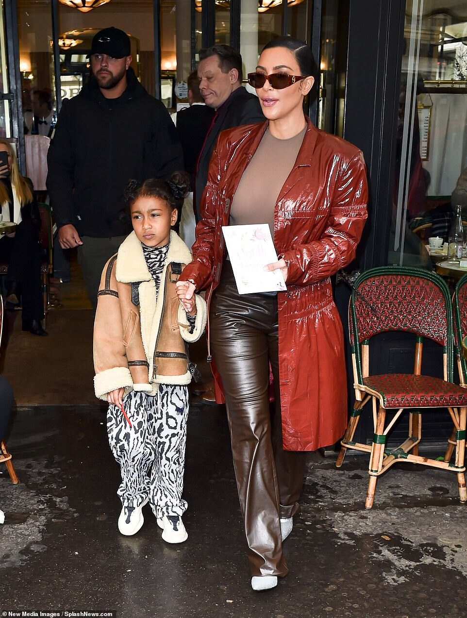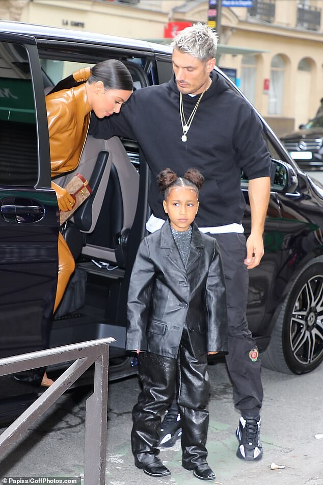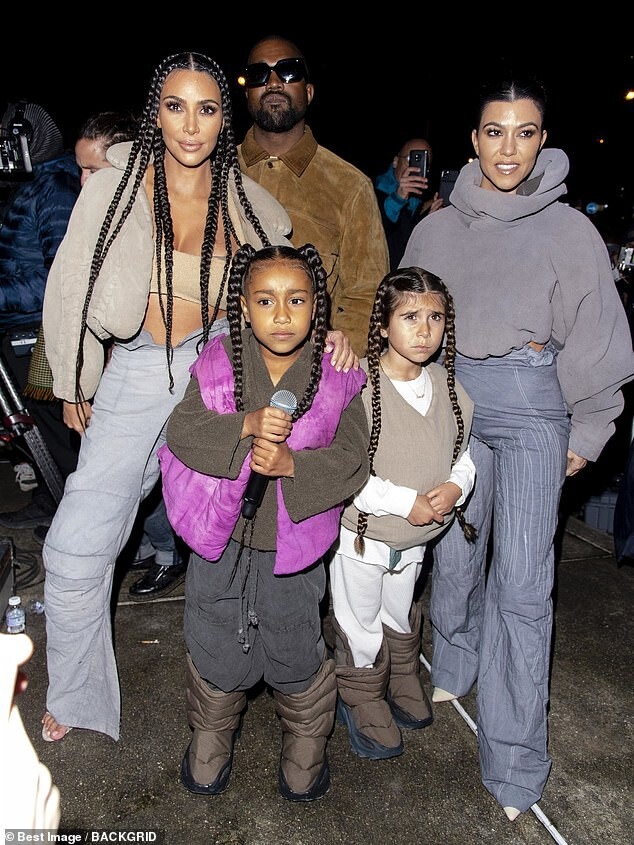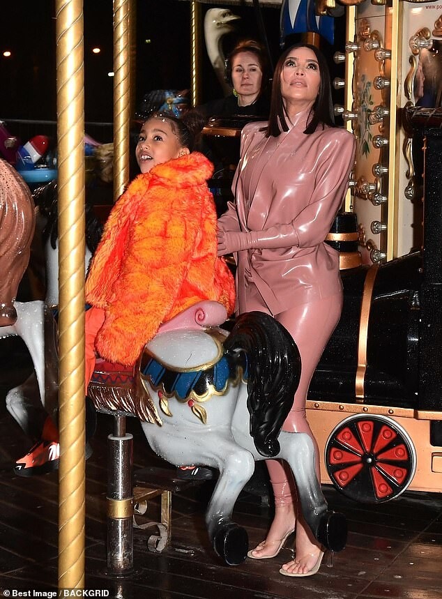 Kourtney Kardashian dons skintight burgundy latex outfit as she is joined by daughter Penelope, seven, and sister Kim for Kanye West's religious Sunday Service in Paris
