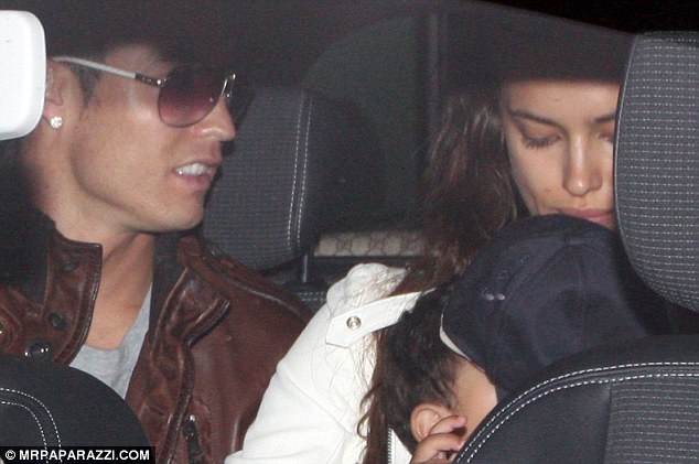 My turn for a cuddle: Irina keeps a tight grip of Cristiano as they head home, with Ronaldo keeping a protective eye over the pair