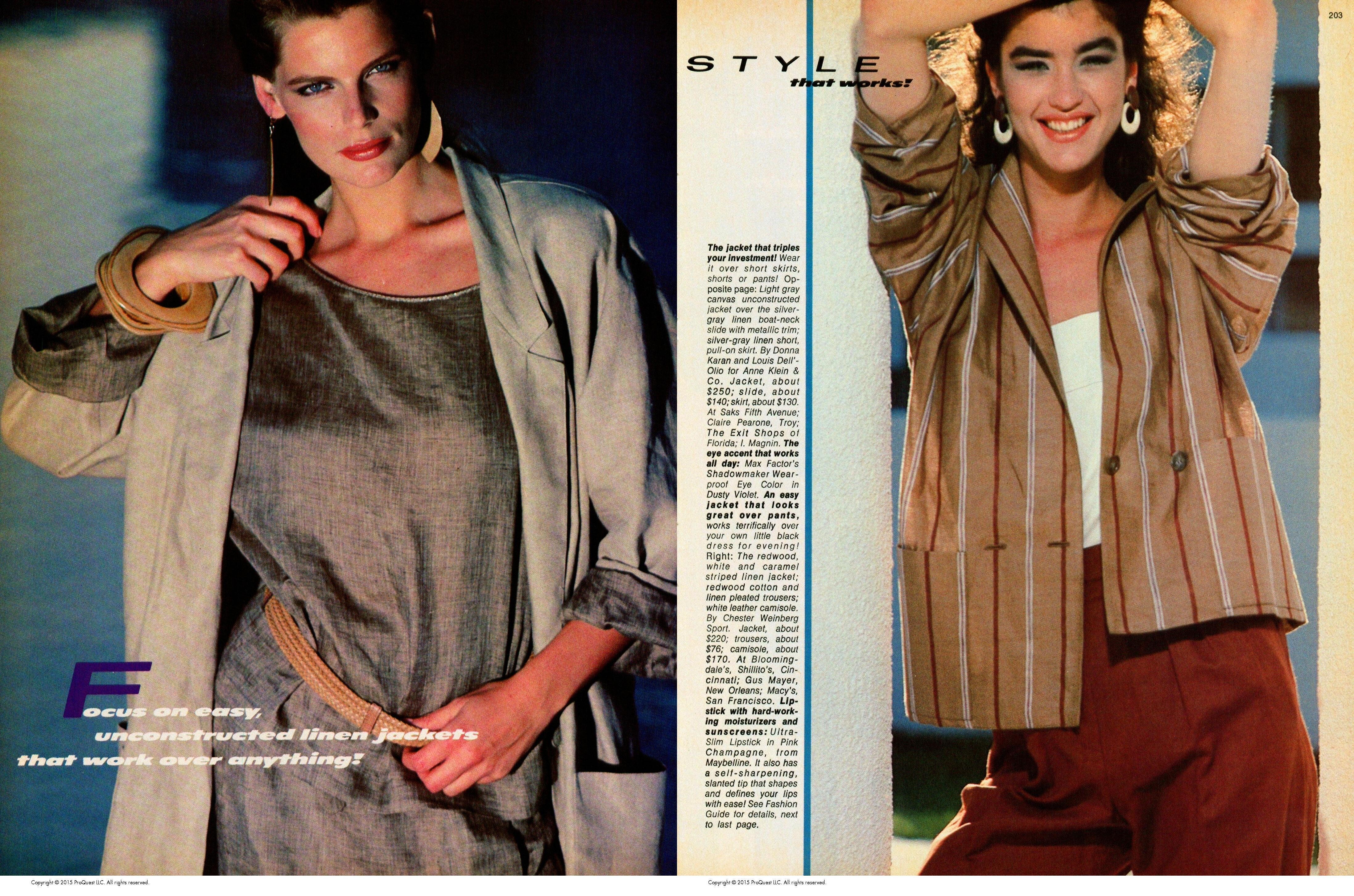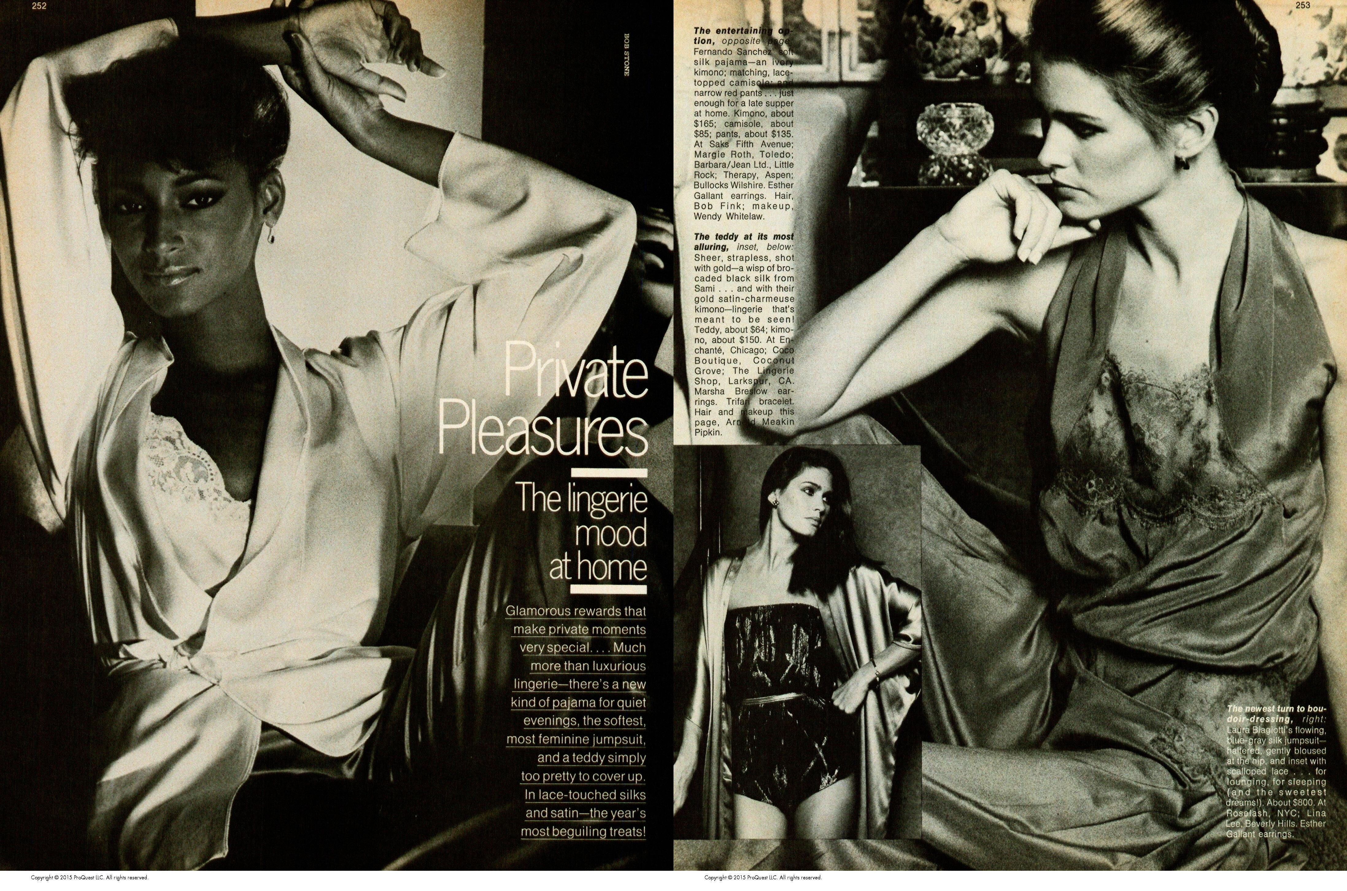 Models: Brooke Shields, Sheryl Lee Ralph, Deborah Burrell, Devine, Isabella Rossellini, Michelle Pfeiffer, Maxwell Caulfield, Alison Price, Lorna Luft, Maureen Teefy, Shaun Casey, Eva Voorhees, Carol Alt, Iman Abdulmajid, Clotilde Holby, Demi Moore, Blanch & Baker, Tanya Tucker