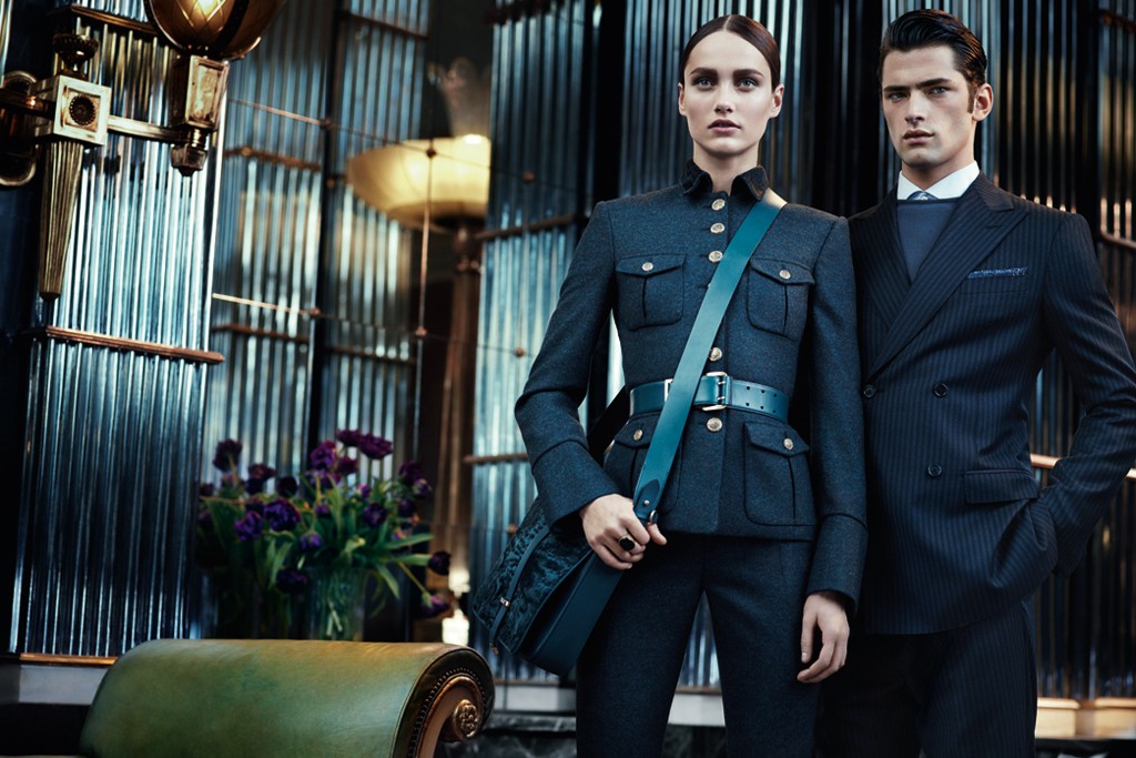 Kate Moss and Karmen Pedaru front Salvatore Ferragamo’s fall campaign, delivering the collection’s rigorous, military style that is combined with softer romantic elements. Photographed by Mikael Jansson in the sumptuous Russian embassy in Berlin with its antique tapestries and ornate furniture, the images reflect creative director Massimiliano Giornetti’s Czarist Russian inspiration this season. Moss is seen lying on a gilded, green leather dormeuse, Pedaru is captured standing in front of an antique painting, while Sean O’Pry poses against “a geometrical play of mirrors and fabrics that recreate fairy tale palaces,” said the company, embodying a “refined and cosmopolitan man.” The ads will break in international media in September. -WWD