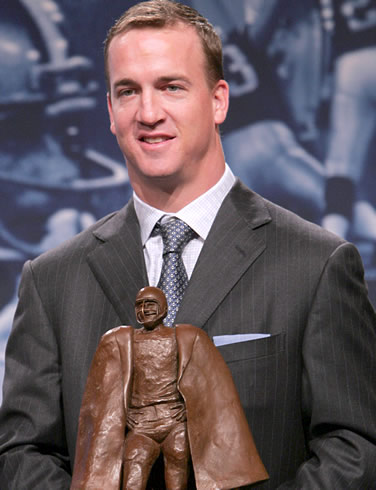 Because of his father's legacy at Ole Miss, Manning stunned many when he chose to attend and play for the University of Tennessee. He became Tennessee's all-time leading passer with 11,201 yards, 863 completions and 89 touchdowns, while compiling a 39-6 record as a starter, setting an SEC record for career wins (although Georgia's David Greene would set a new record of 42 wins in 2005). In his college career, he threw only 33 interceptions in 1,381 attempts, an NCAA record for best all-time interception percentage. He was 3-1 in his four bowl appearances. He completed his degree in three years, a BA in speech communication with a 3.61 GPA and Phi Beta Kappa honors, and was projected to be the top overall pick in the NFL Draft but returned to Tennessee for his senior year. In his senior season, Manning threw for 3,819 yards and 36 touchdowns, lead the Vols to the SEC title and finished second in 1997 Heisman Trophy voting to the University of Michigan's Charles Woodson. Manning received the 1997 James E. Sullivan Award as the top amateur athlete in the United States. In 2005, Tennessee retired Manning's number (#16), making him only the 3rd Tennessee player to have his number retired while still living. One of the streets leading to Neyland Stadium has been re-named Peyton Manning Pass.