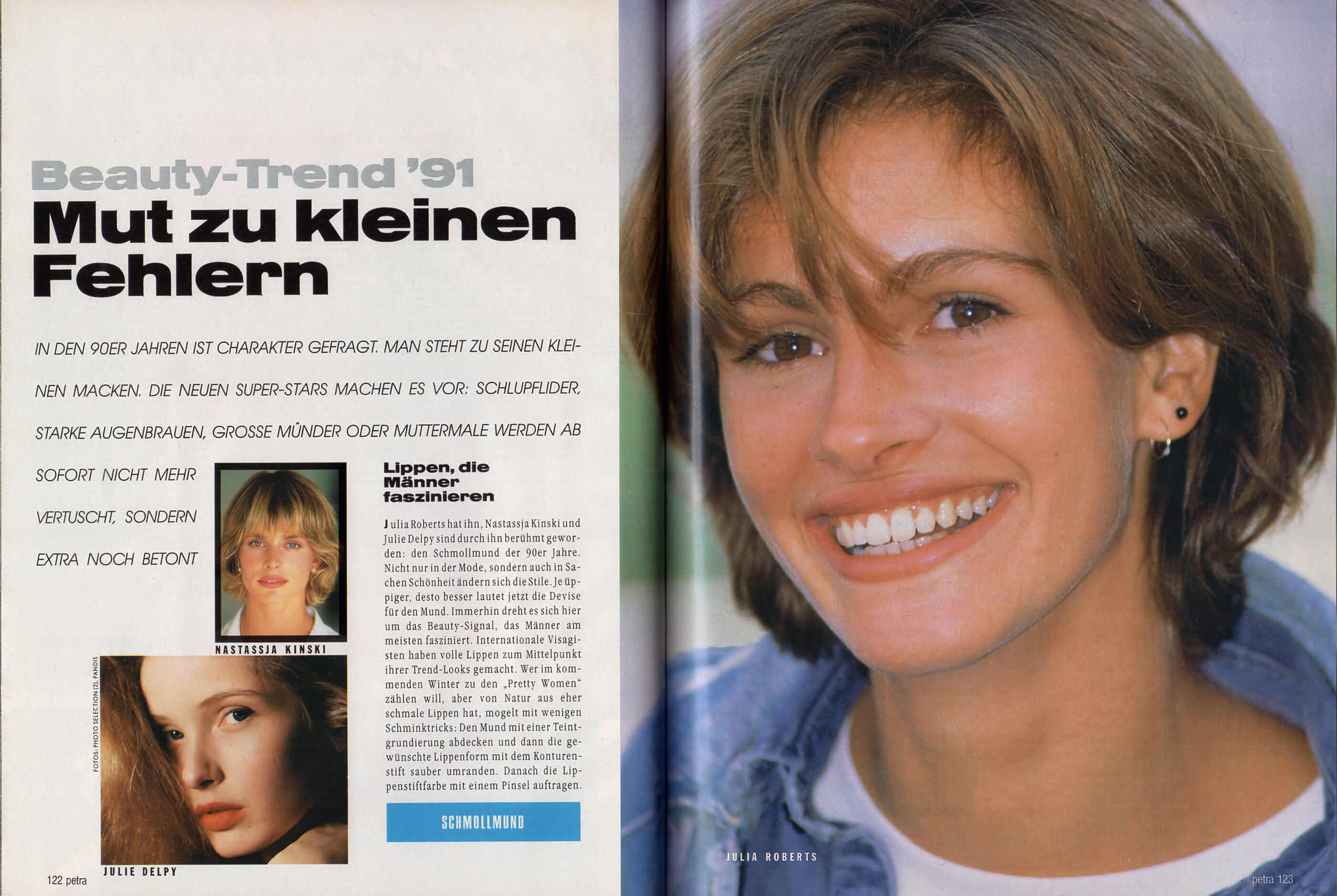 "Beauty-Trend ´91 Mutz zu kleinen Fehlern" - petra Germany September 1991 (26. August 1991) - also showing Nastassja Kinski, Julie Delpy, Julia Roberts, Kim Basinger, Claudia Schiffer, Andie MacDowell, Brooke Shields, Cindy Crawford, Lisa Stansfield