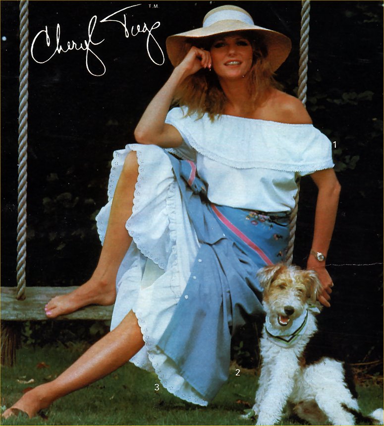 Anyway, I'm looking for a scan from one of her Sears catalog appearances. It has Cheryl sitting on a swing (I think), wearing a sundress, and she is in her bare feet. I think she's wearing a hat, if I recall correctly. Anyway, this would have been from probably 1985 or possibly 1986. . . most likely the spring/summer catalog.