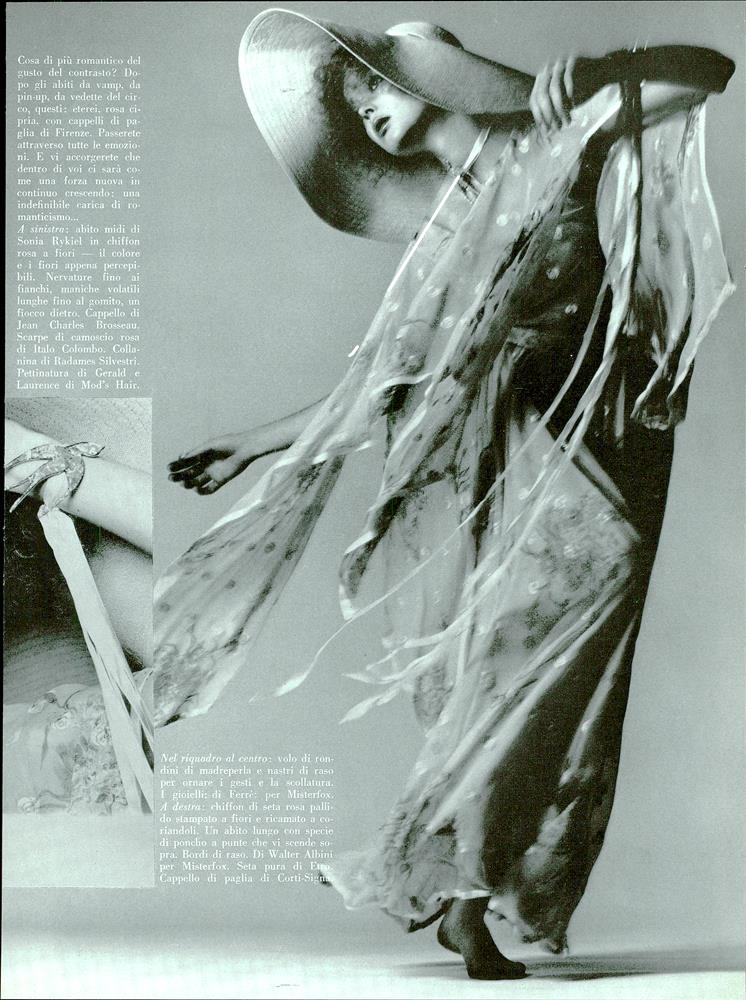It is a very profitable period professionally that sees him engaged in the creation of numerous and important fashion services. In particular, a portfolio of images, published in the main national and international magazines, which have as protagonists the most famous Italian actresses of the moment, including Lollobrigida herself, Claudia Cardinale, Virna Lisi, Rosanna Schiaffino and Ewa Aulin, portrayed together with their children. Now launched in the world of Haute Couture, he collaborates with large ateliers such as Valentino, Fendi, Sorelle Fontana, Barocco, Andrè Laug, Capucci, Laura Biagiotti and many others.