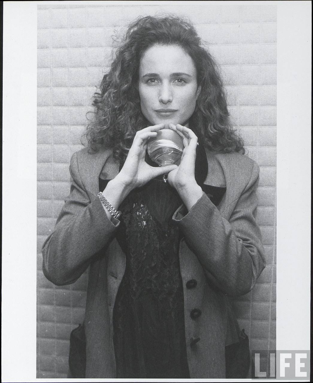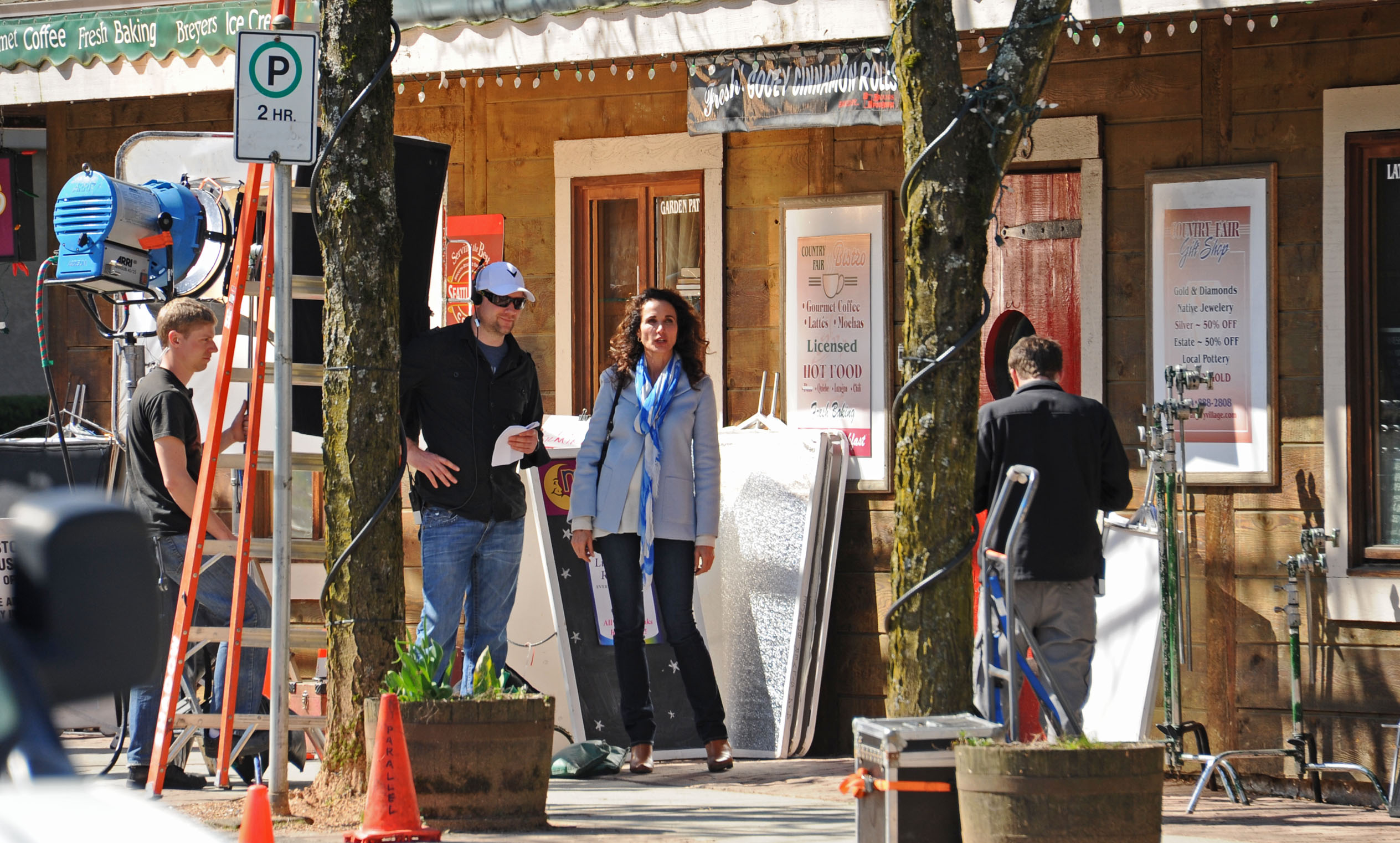 Andie MacDowell looks Spring fresh in smart casual pastel blue blazer. MacDowell flashed the peace sign at photographers and fans whilst filming a TV pilot in Vancouver, Canada, called 'Cedar Cove.' The actress showed off a sleek look with a smart casual outfit tied together with a blue and white scarf on a sunny day in Vancouver. MacDowell was happy to pose up for pictures with fans as she filmed outdoor scenes throughout the day.