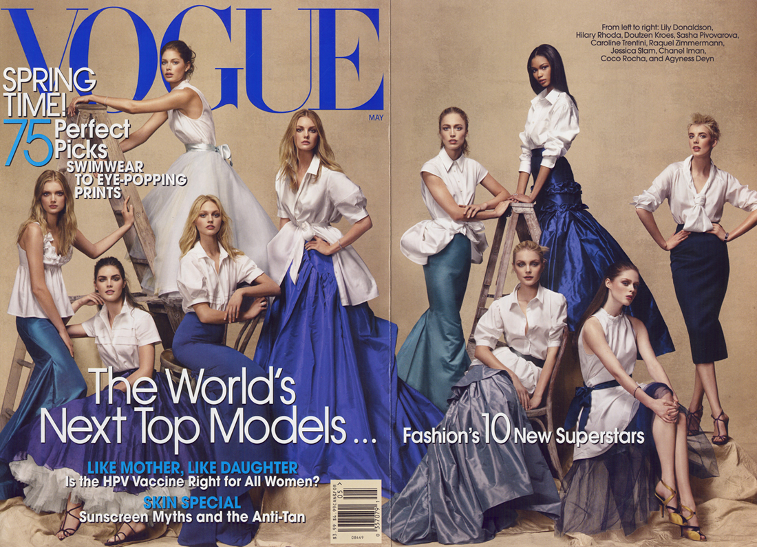 sasha looks like a demon snejana just looks like a freak. They both look identical....sasha bugs her eyes out and snjana pushes her nose out like she is sniffing for something. Neither of them have bodies....they are like a bag of antlers... BESIDES SNEJANA IS ANOREXIC!!!!!....YOU CANT PUT AN ANOREXIC MODEL AS THE SYMBOL OF MODELING WHICH OTHER MOTHERS SHOULD ASPIRE TO! The girl has a desease and until she deals with it she should not be alowed to step infront of a camera!Half these broads will never be "supermodels" but i guess that wasnt really the point of the cover which is dissapointing because i thought it was supposed to be bringing back the "supermodels". Every single girl on that cover is blonde...to me that doesnt say supermodel....that says boring white bread mal nurished models ....yes they are popular but the point is they dont deserve to be. YEs their is some good ones. Lily cole deserves the cover. Lily D is over now aswell.